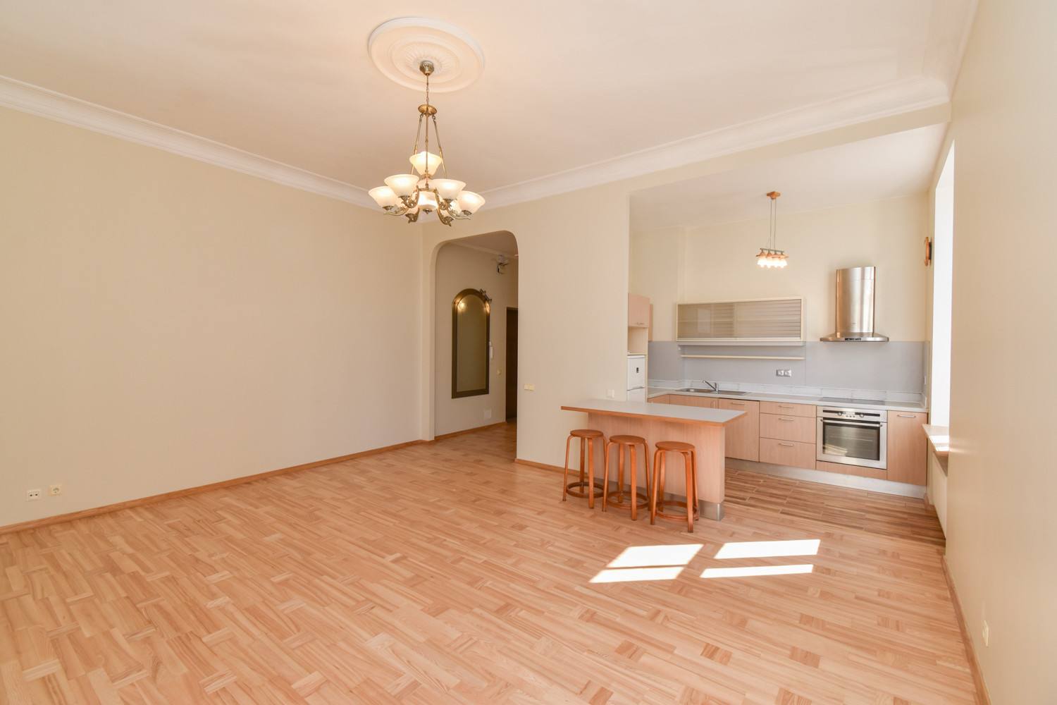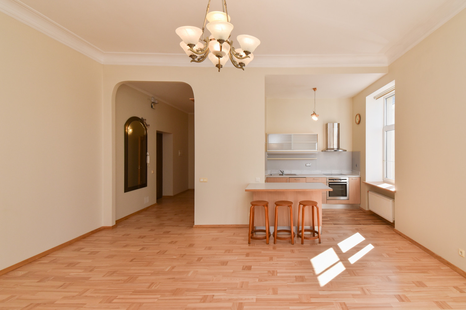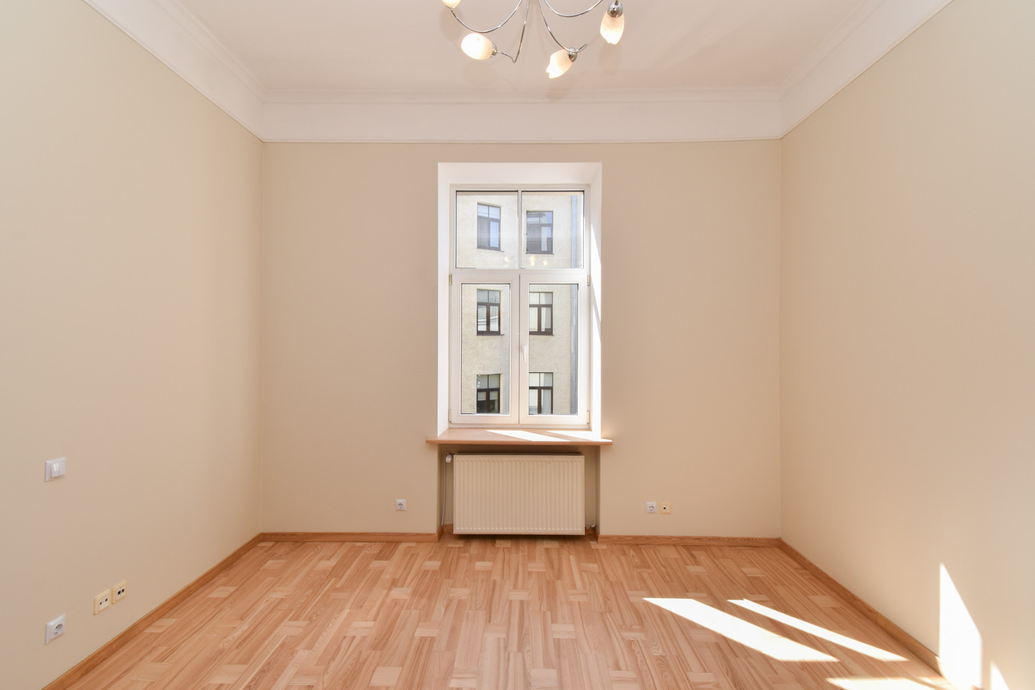 A spacious, Art Nouveau four-room apartment after renovation in the quiet center of Riga, in a renovated facade building. The apartment is located on the 4th/6th floor of the building. New elevator.