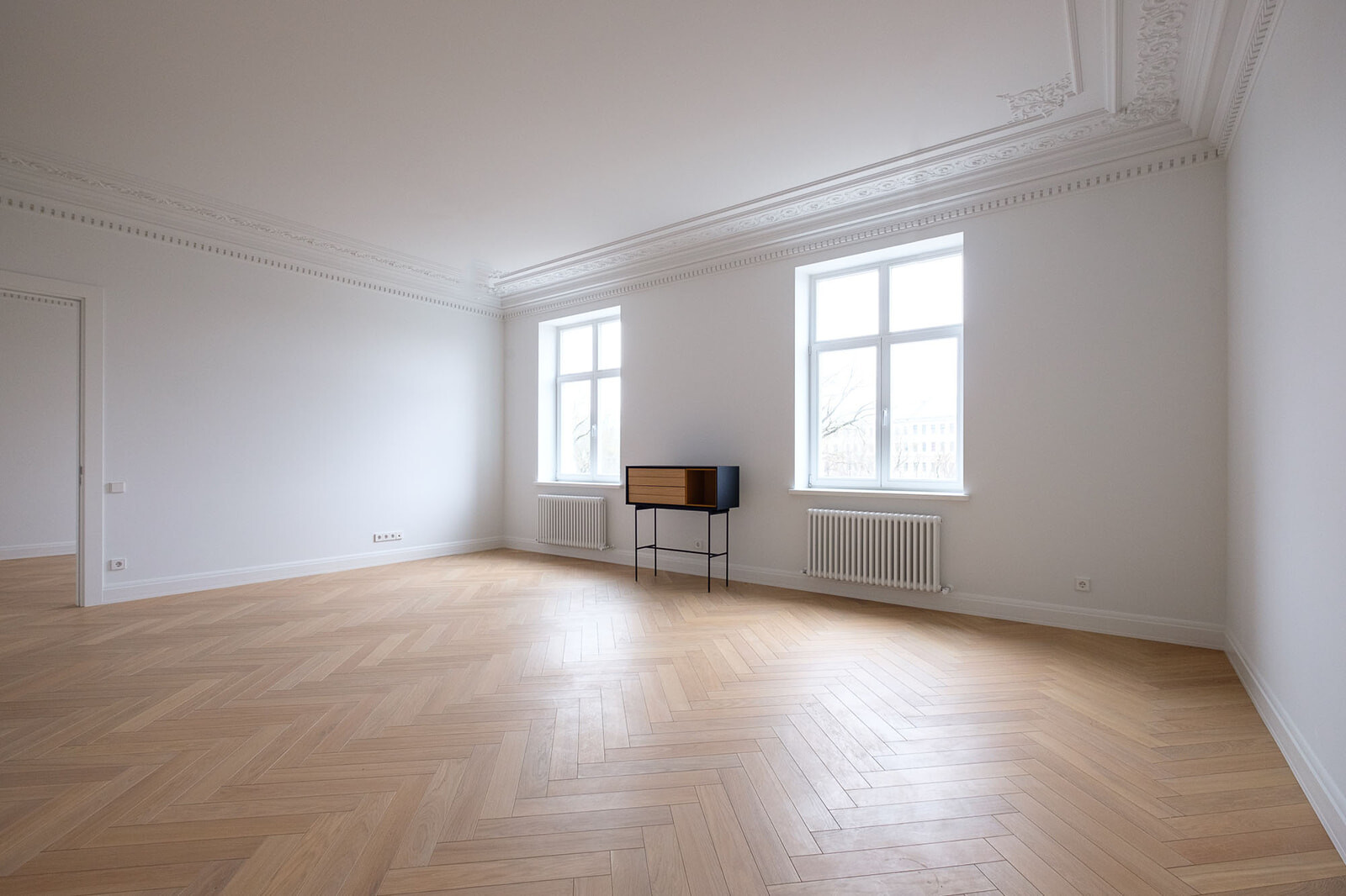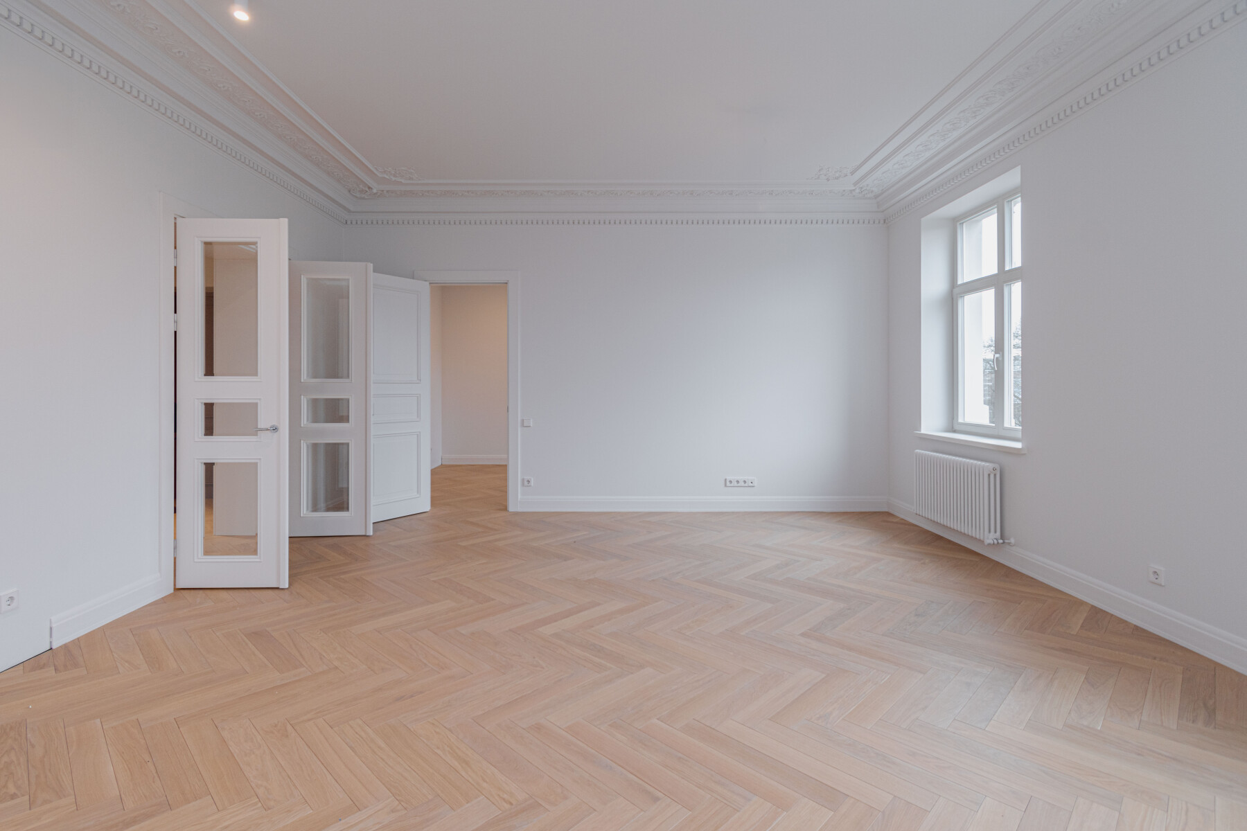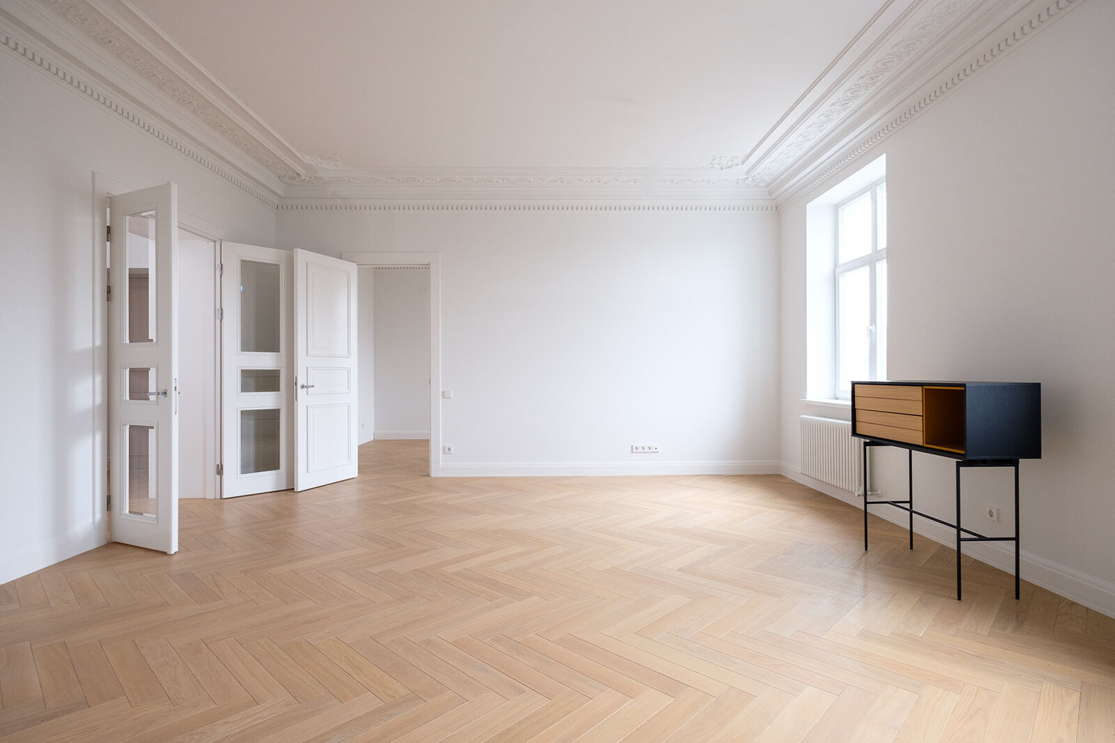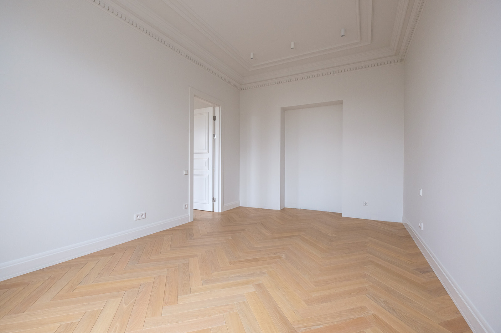 Renovated building with excellent and high-quality interior decoration of apartments - oak parquet, sophisticated fittings, door handles and radiators, stone baths, high-quality sanitary ware from the manufacturer Flaminia, gray-white marble imitation Italian tiles, water mixers from the manufacturer Giulini. Special value is given to the apartments by the restored ceiling decorations and cornices, selected classic high skirting boards, 2.4 m high doors manufactured according to the original design.