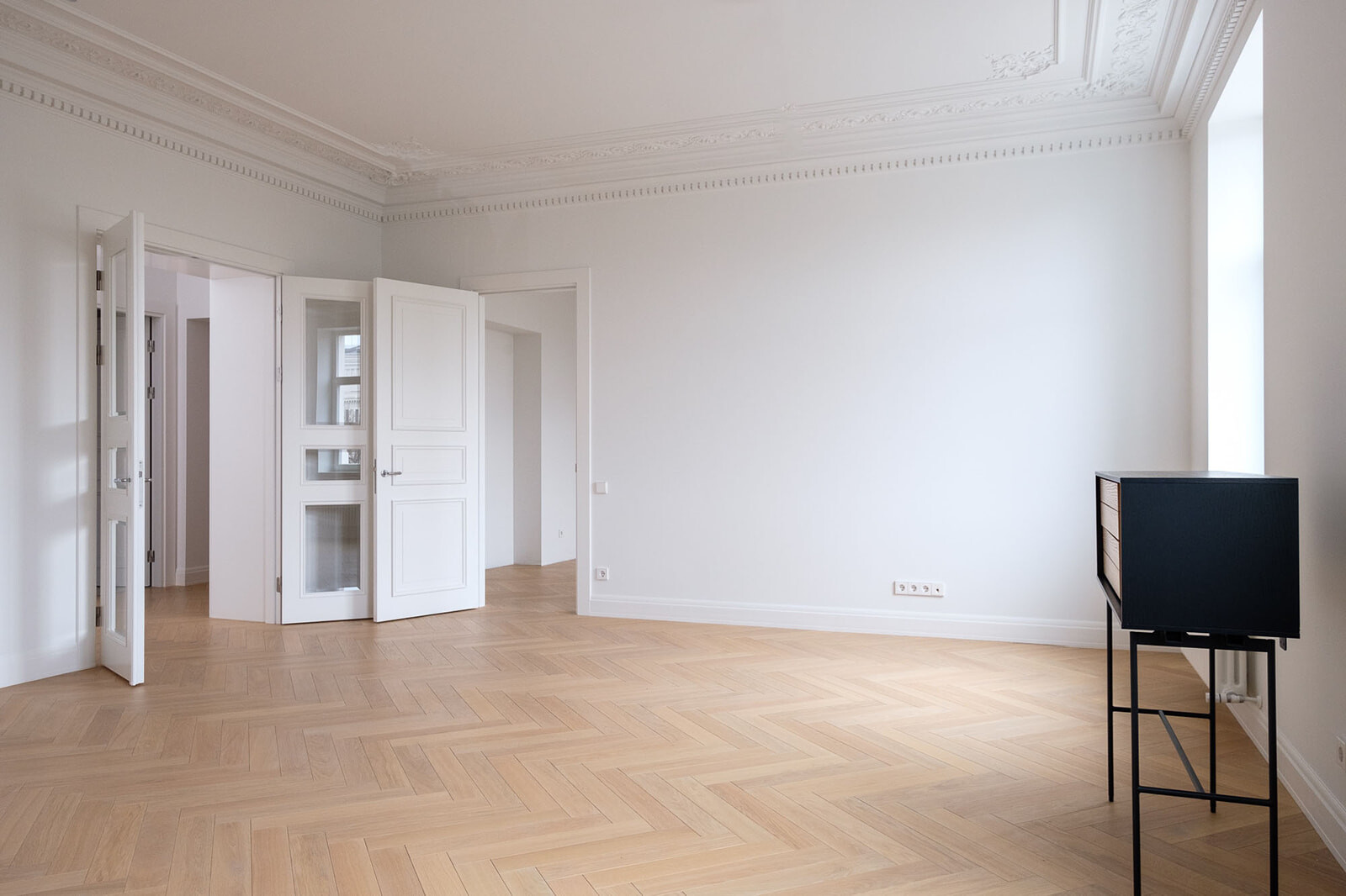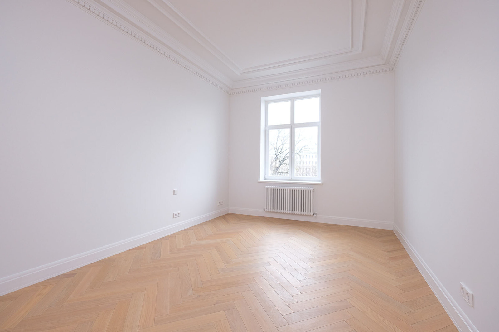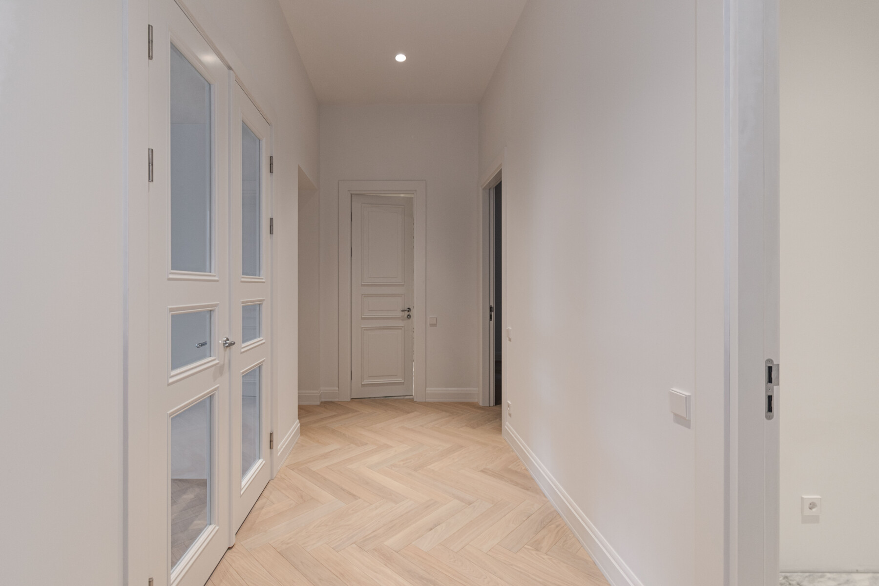 Renovated building with excellent and high-quality interior decoration of apartments - oak parquet, sophisticated fittings, door handles and radiators, stone baths, high-quality sanitary ware from the manufacturer Flaminia, gray-white marble imitation Italian tiles, water mixers from the manufacturer Giulini. Special value is given to the apartments by the restored ceiling decorations and cornices, selected classic high skirting boards, 2.4 m high doors manufactured according to the original design.