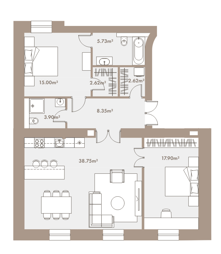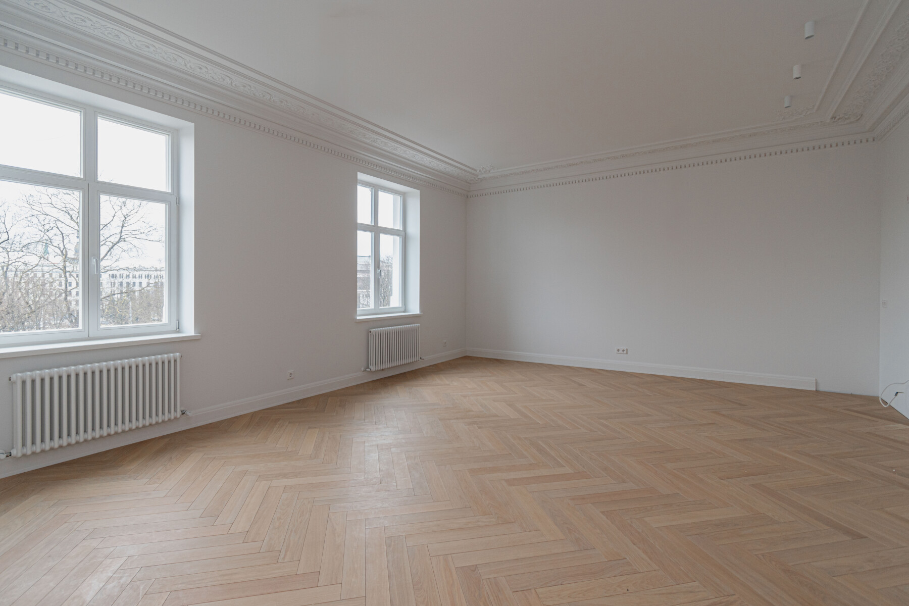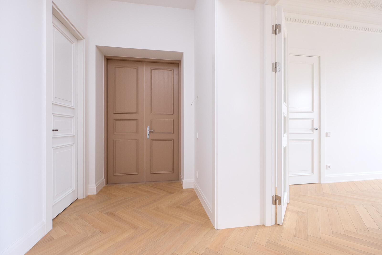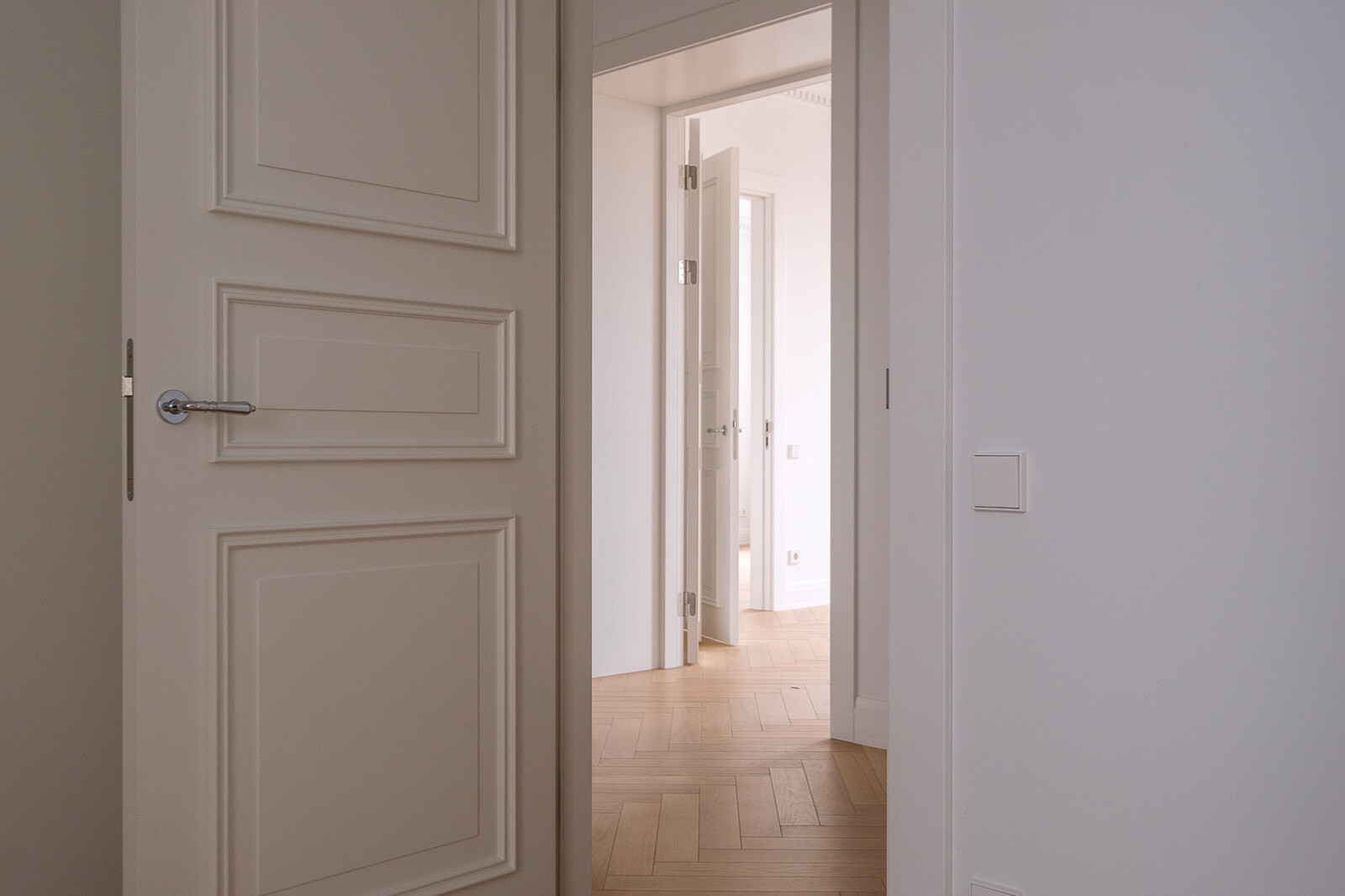 Renovated building with excellent and high-quality interior decoration of apartments - oak parquet, sophisticated fittings, door handles and radiators, stone baths, high-quality sanitary ware from the manufacturer Flaminia, gray-white marble imitation Italian tiles, water mixers from the manufacturer Giulini. Special value is given to the apartments by the restored ceiling decorations and cornices, selected classic high skirting boards, 2.4 m high doors manufactured according to the original design.
