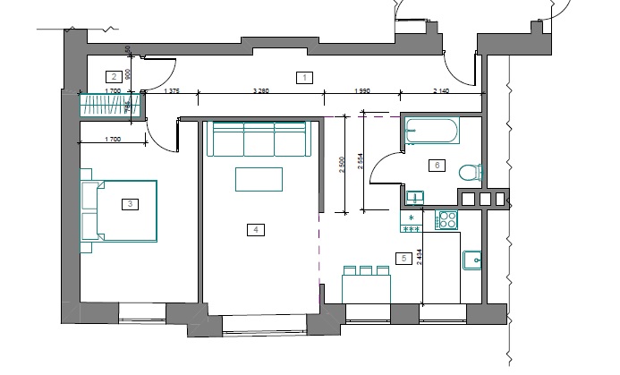 The apartment: Separate kitchen area with a window and a dining area, living room with a bay window, bedroom of 19m², utility / wardrobe room, bathroom.