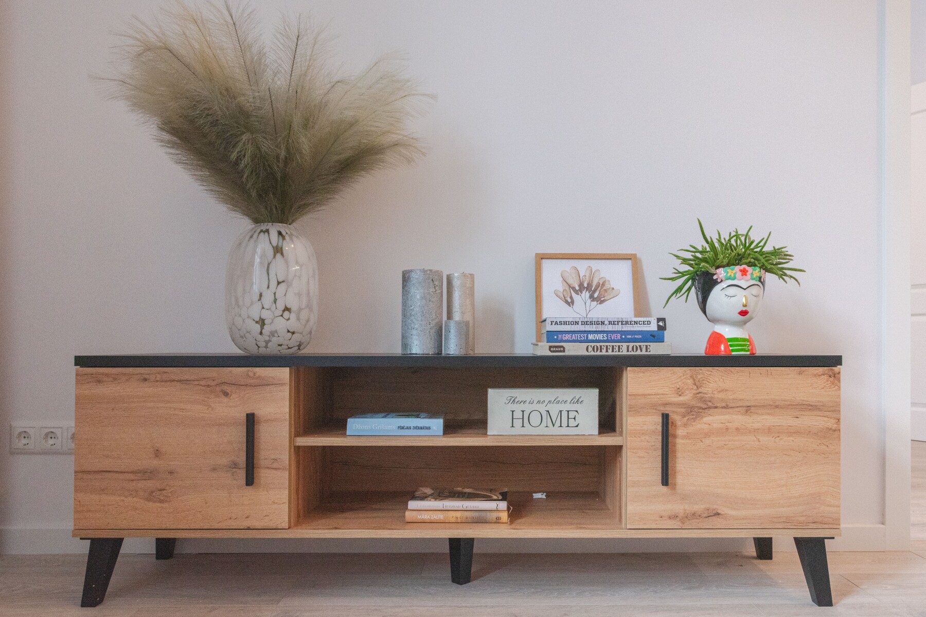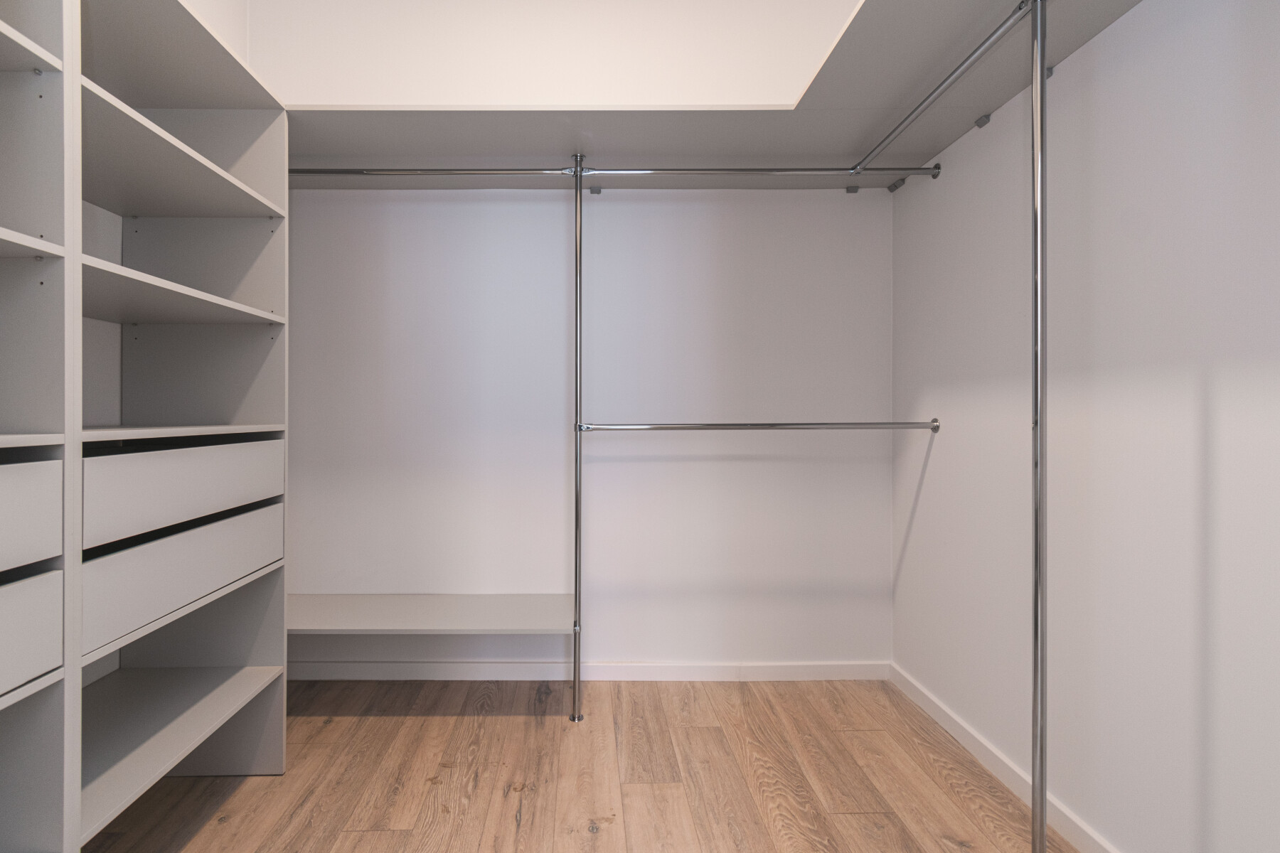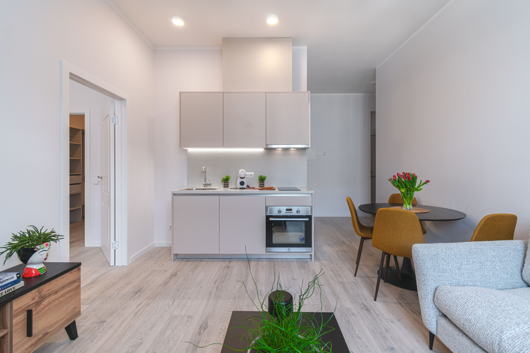 The apartment features a well-thought-out layout, consisting of an entrance hall, a living room combined with a kitchen area, a bedroom with wardrobe room, and a spacious bathroom with a shower. The apartment comes with built-in wardrobes, kitchen furniture, curtains, and lighting fixtures.