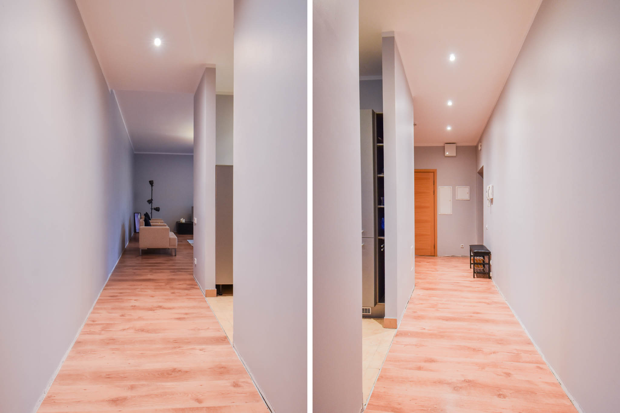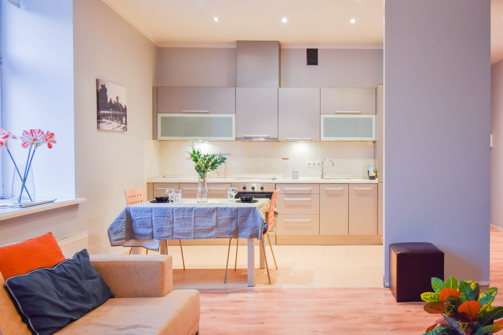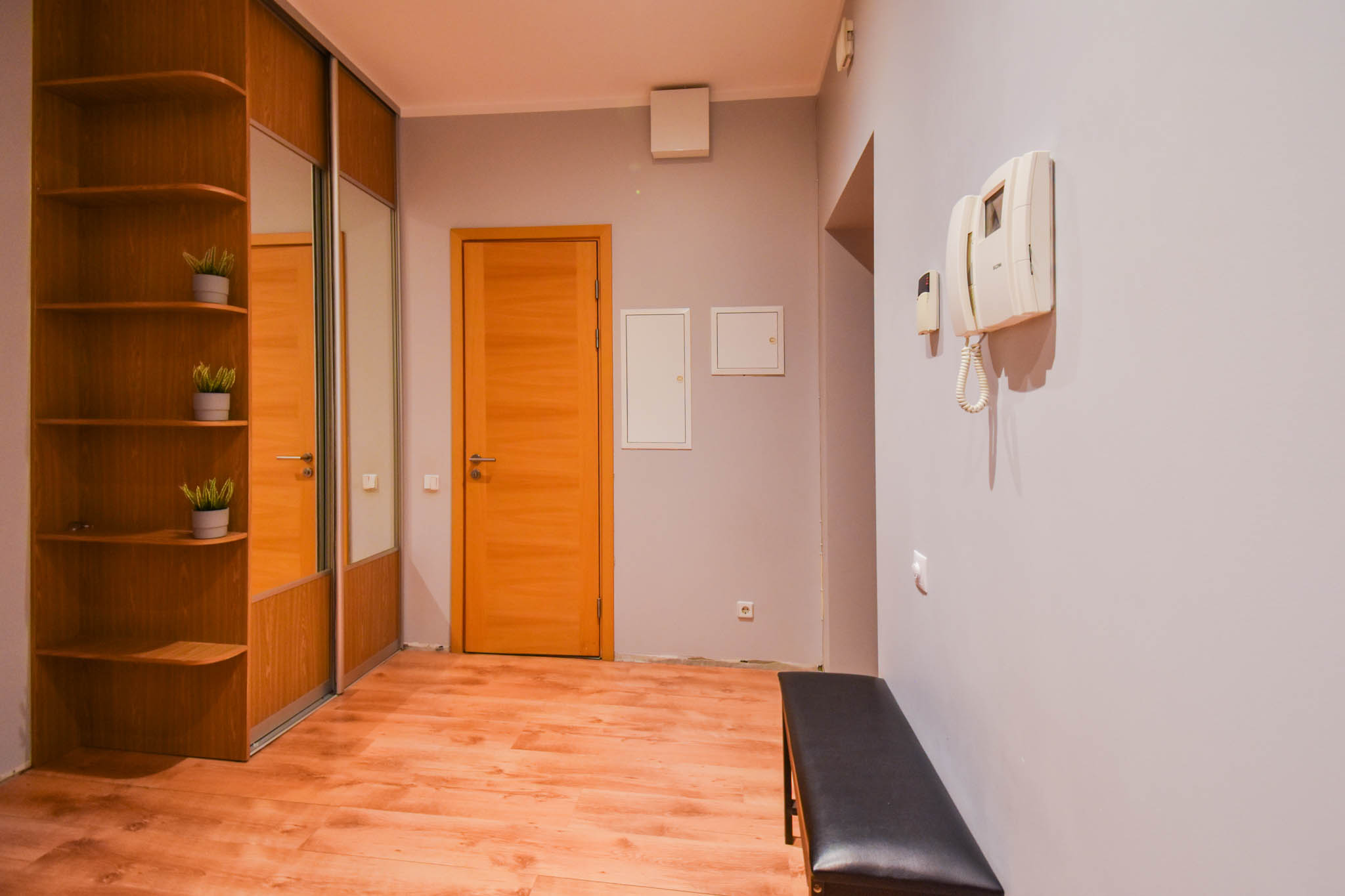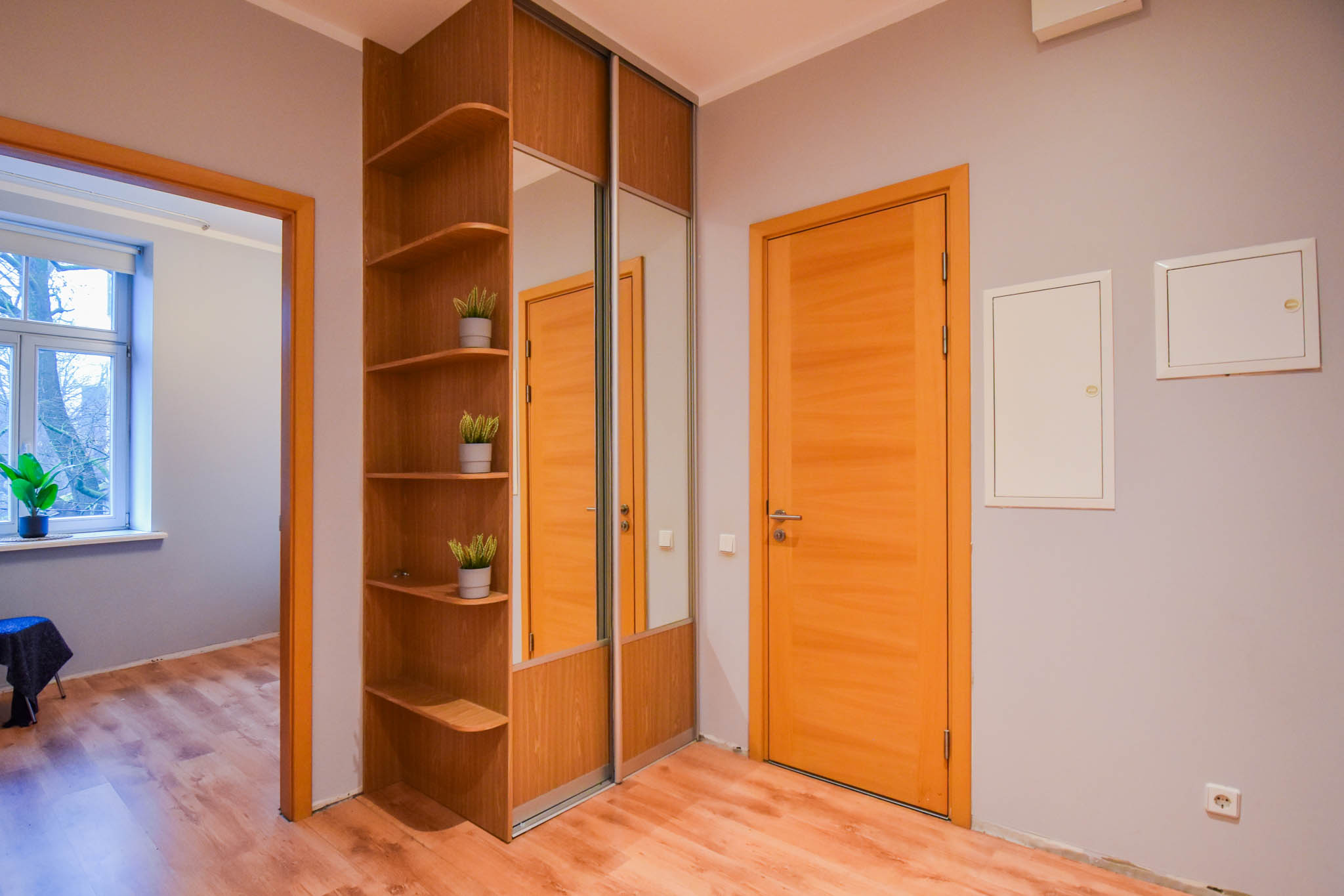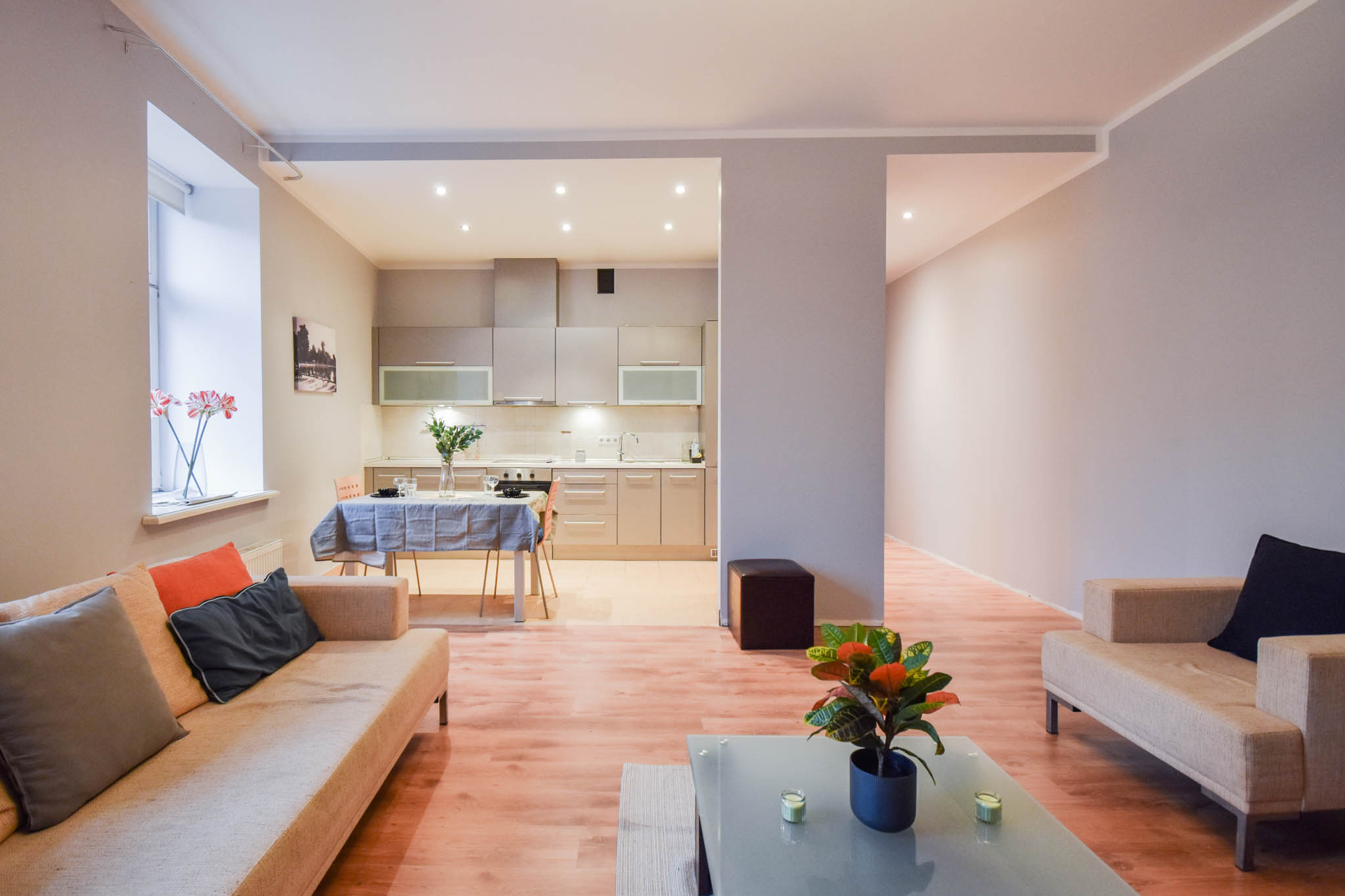 Spacious studio-type living room, combined with a kitchen, anteroom with a built-in wardrobe, bedroom and bathroom.