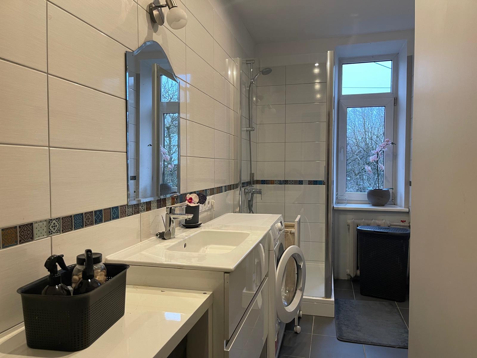 The layout includes a spacious living room combined with kitchen, separated bedroom, a hallway, and a bathroom with a shower. The apartment is quiet, furnished, equipped with household appliances (kitchen appliances, bathroom equipment, washing machine).