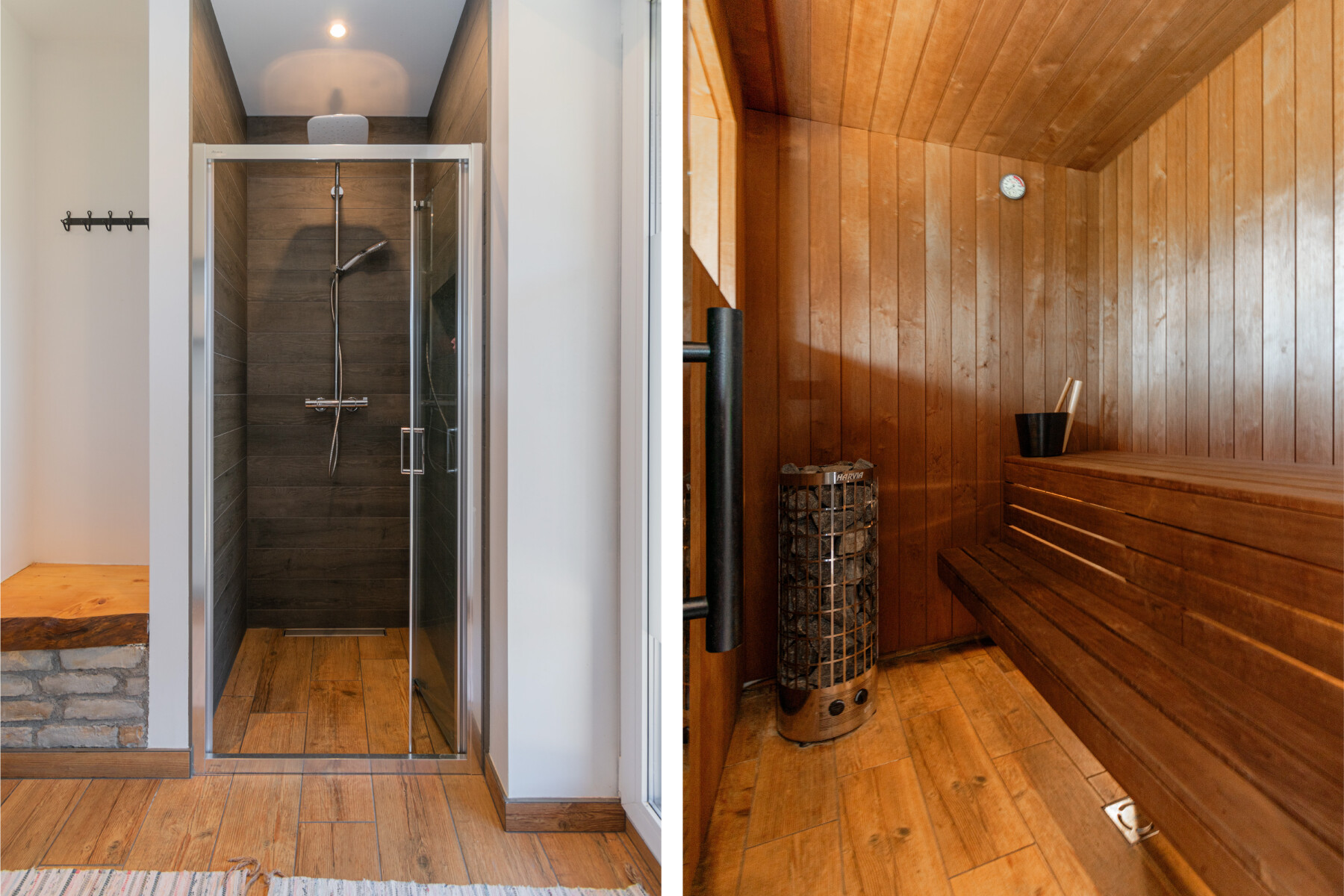 Spacious living room with high ceilings, kitchen area, dining area, fireplace, 4 separate bedrooms, technical and laundry room, sauna with shower and exit to a large terrace, guest bathroom, garage for two cars.