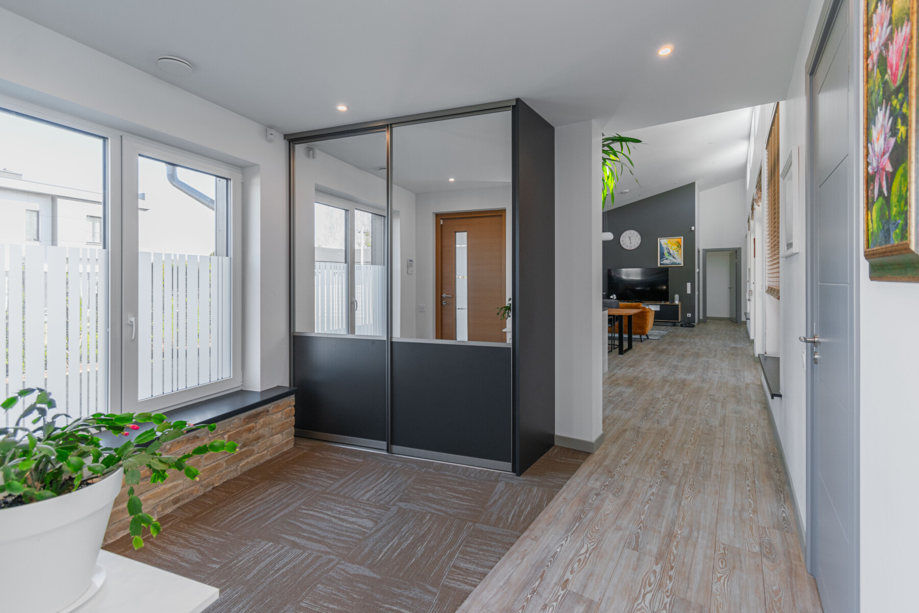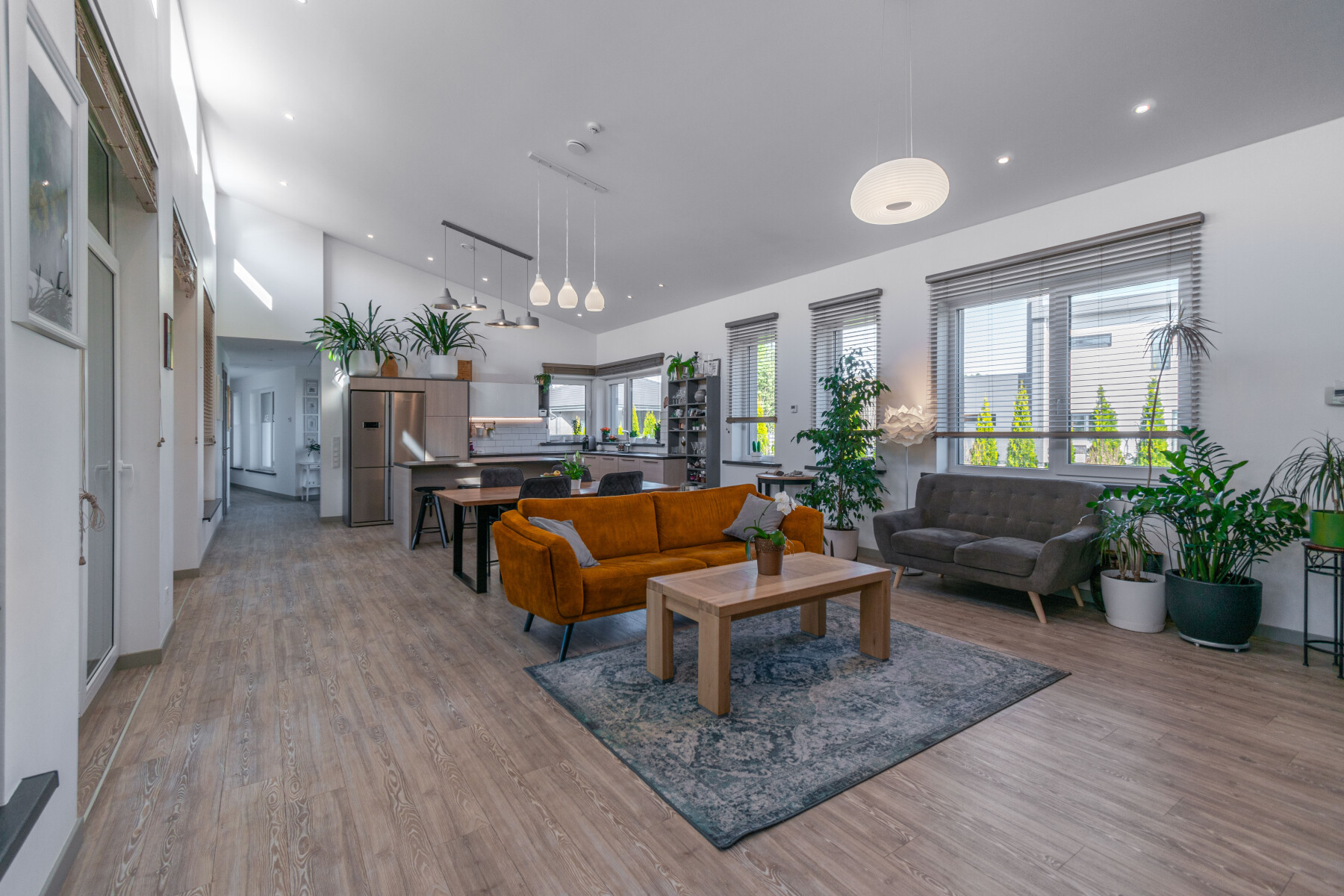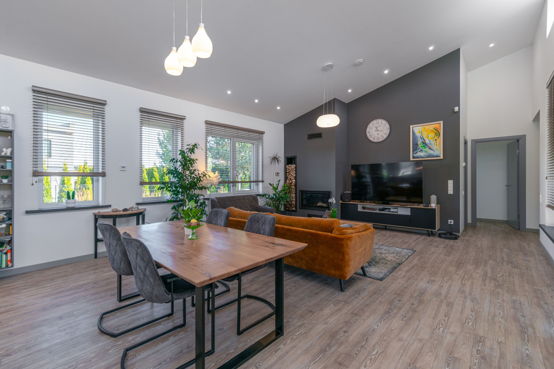 A modern and energy-efficient private house with a large and well-maintained backyard area is offered for purchase. The interior is designed in a Scandinavian style, which fits perfectly with the thoughtful planning of the property.