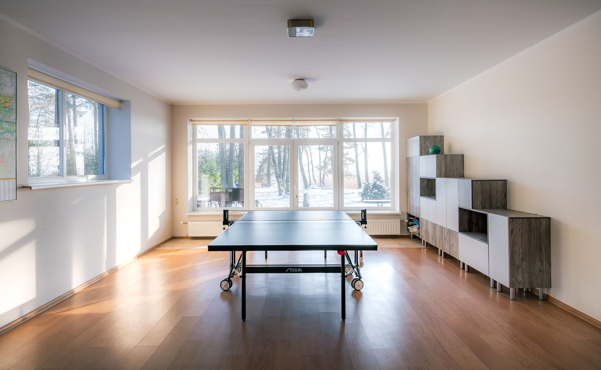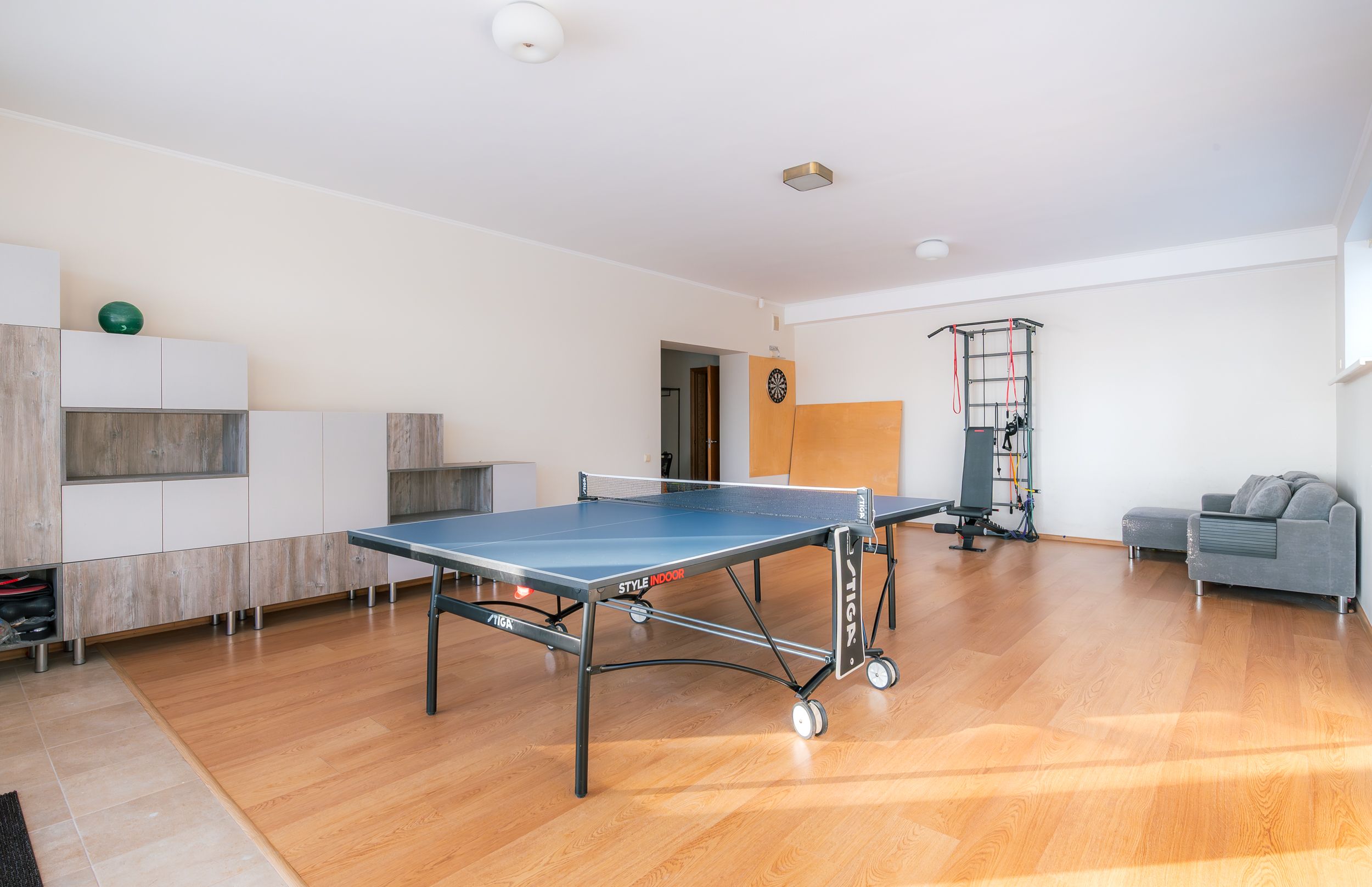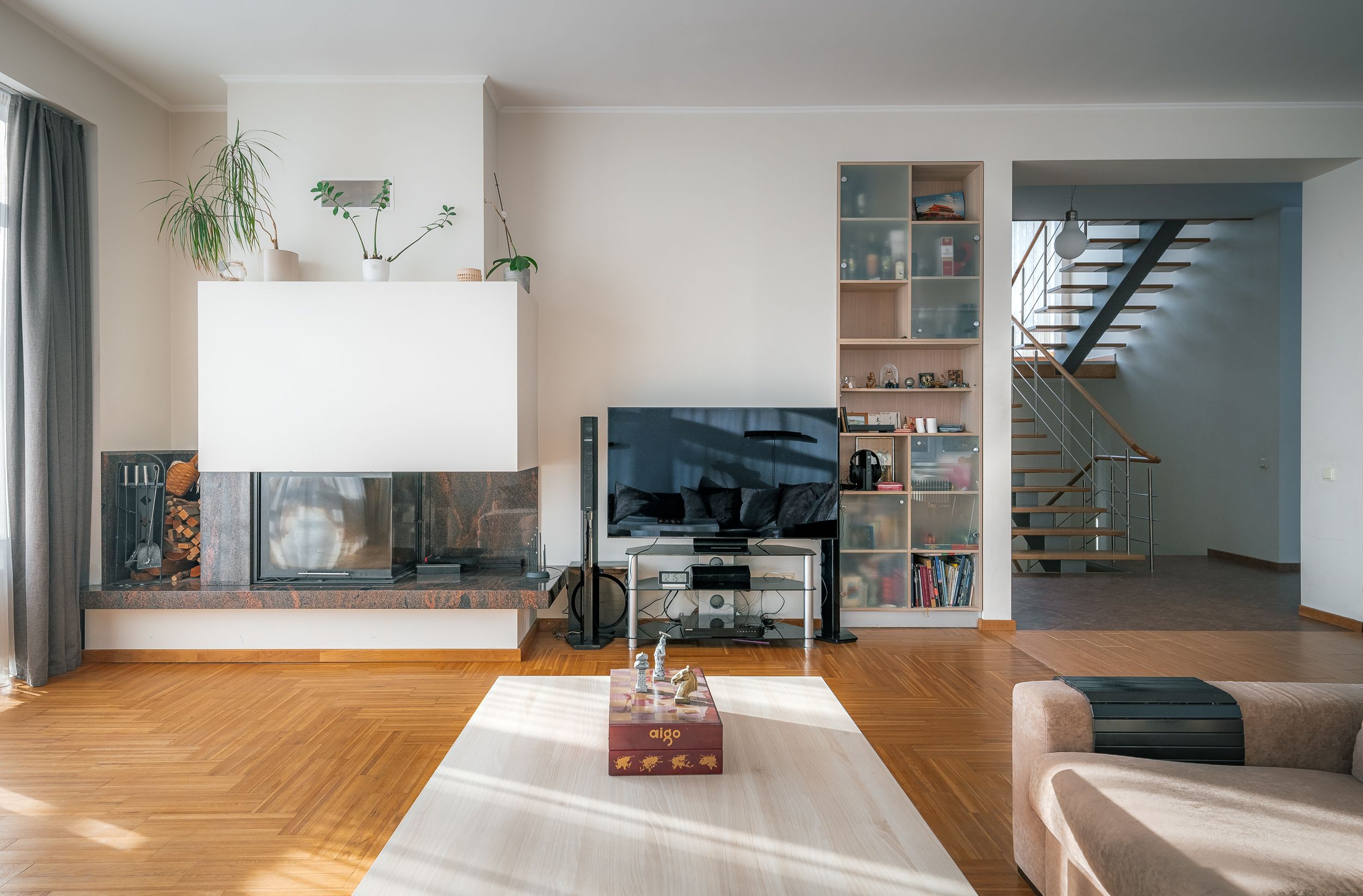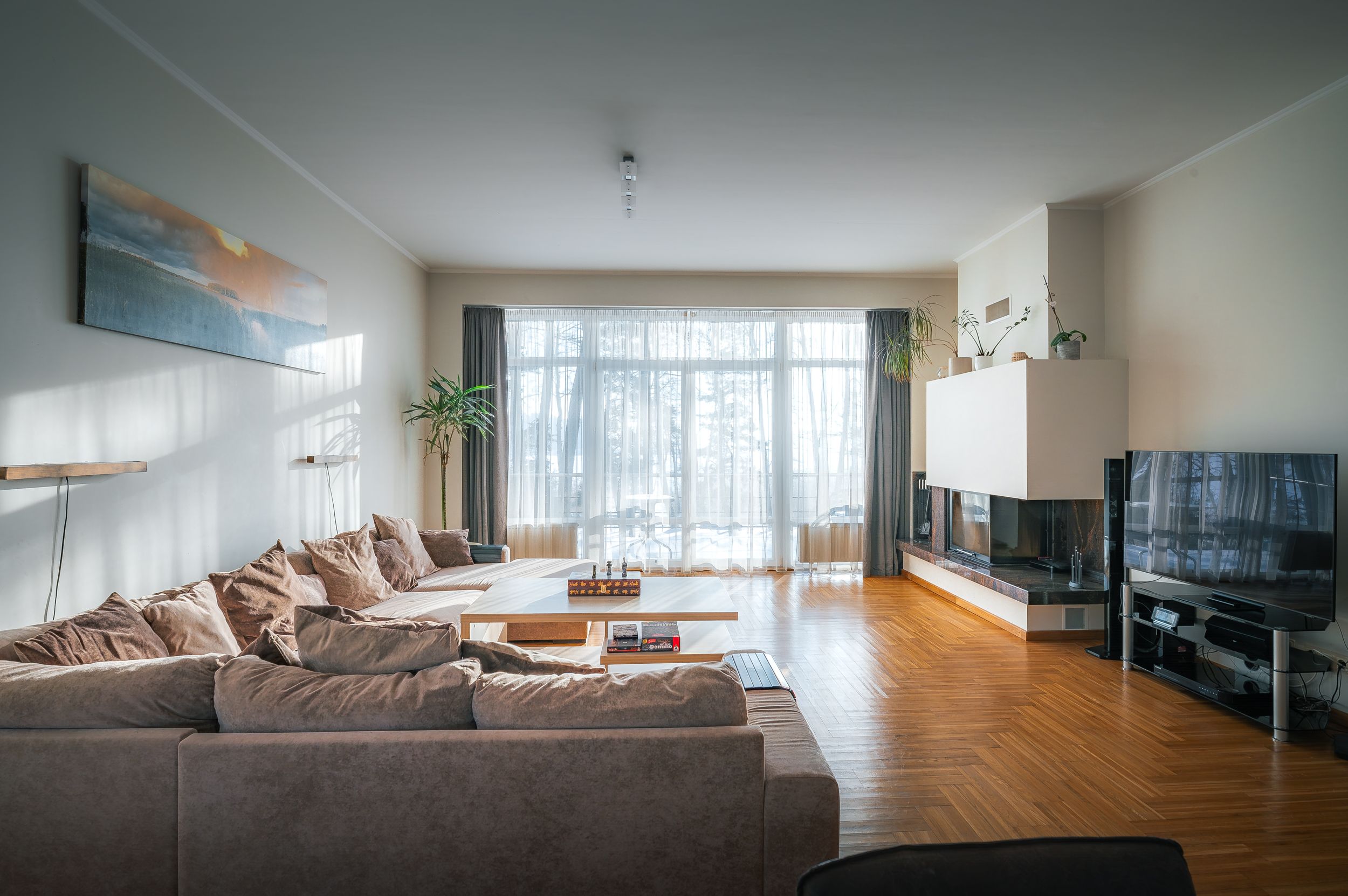 Natural and long-lasting materials are used in the interior – oak parquet flooring and stairs, wooden interior doors, and a neutral colour palette that creates a calm, harmonious, and welcoming atmosphere. High ceilings add light and a sense of spaciousness, while the fireplace in the living room creates a special sense of cosiness during the autumn and winter seasons.
