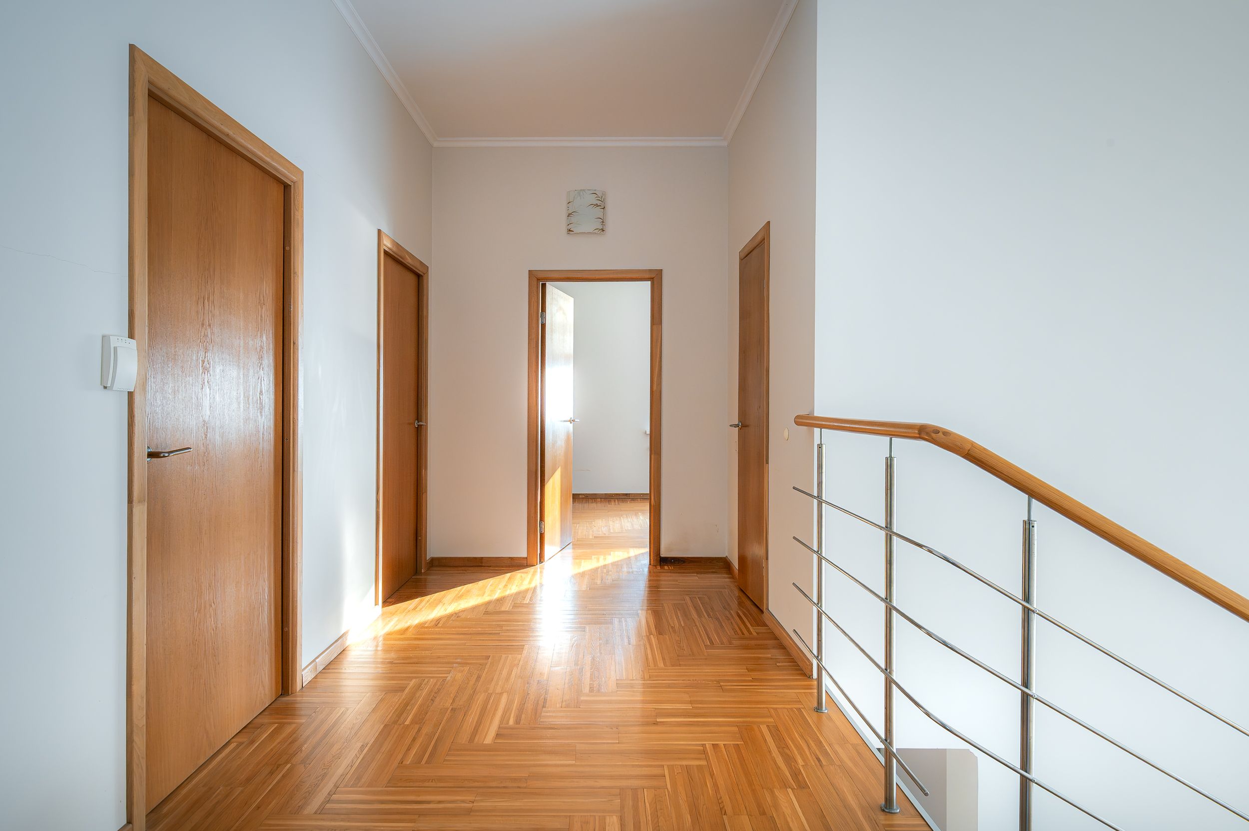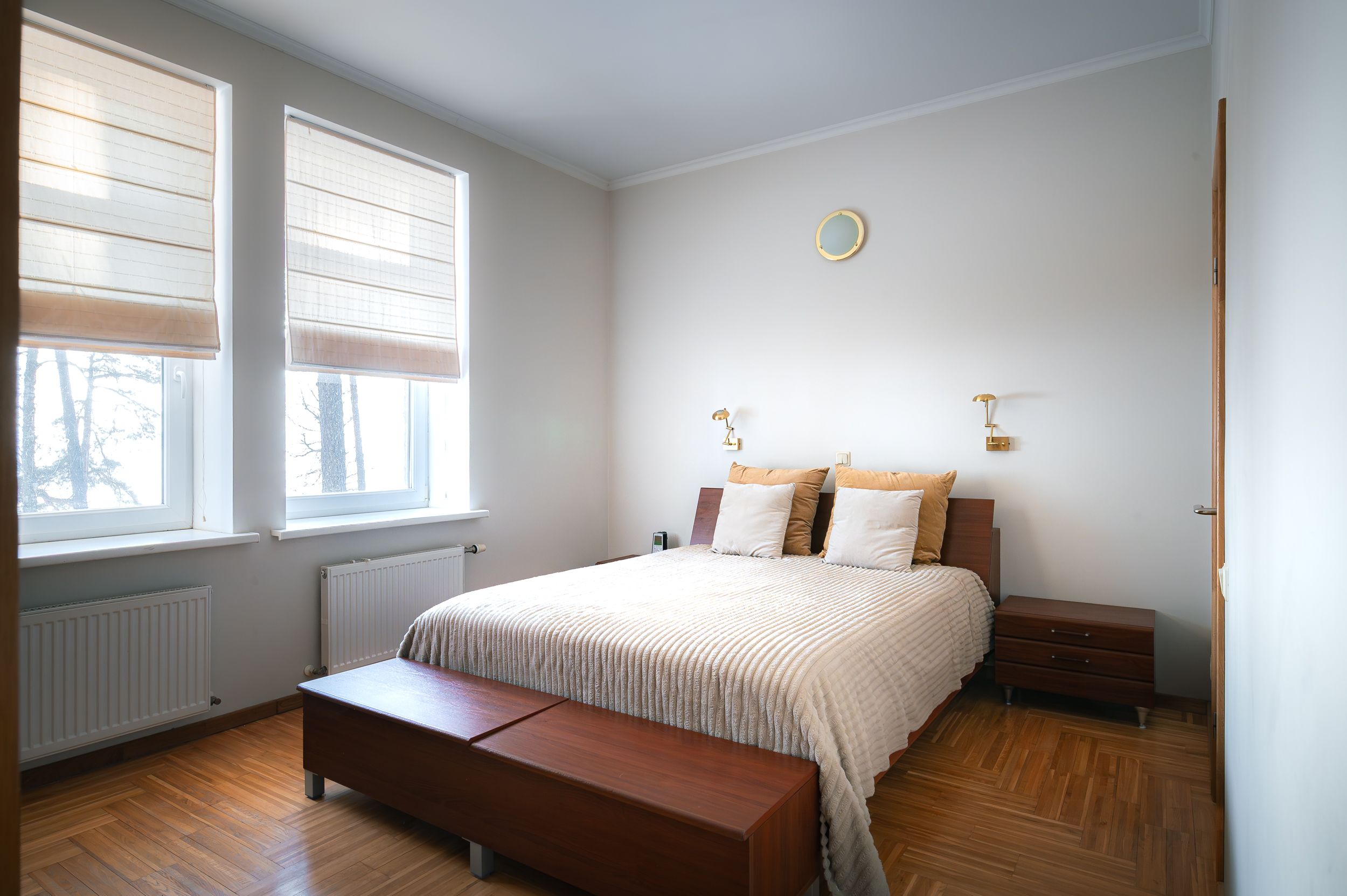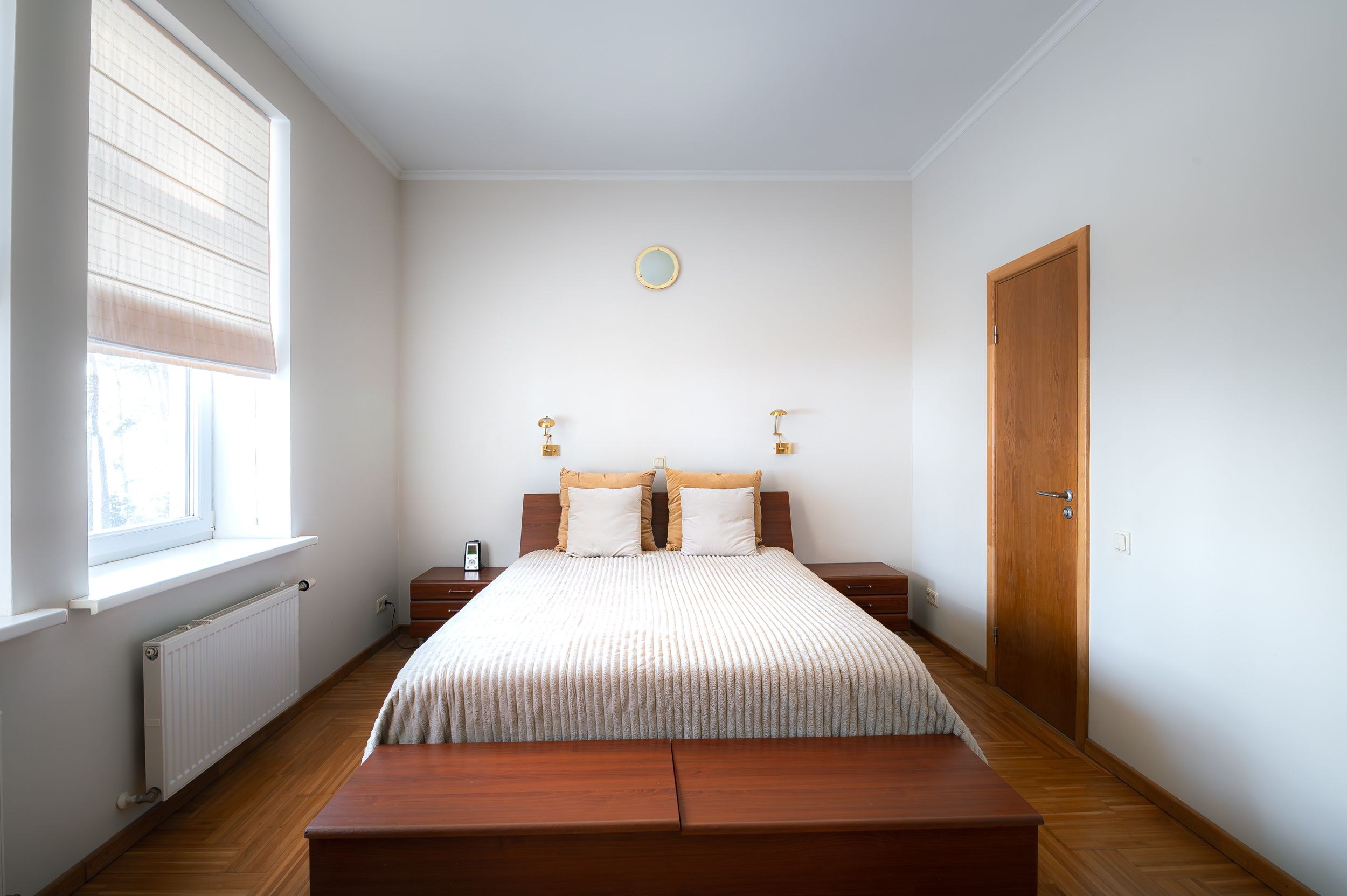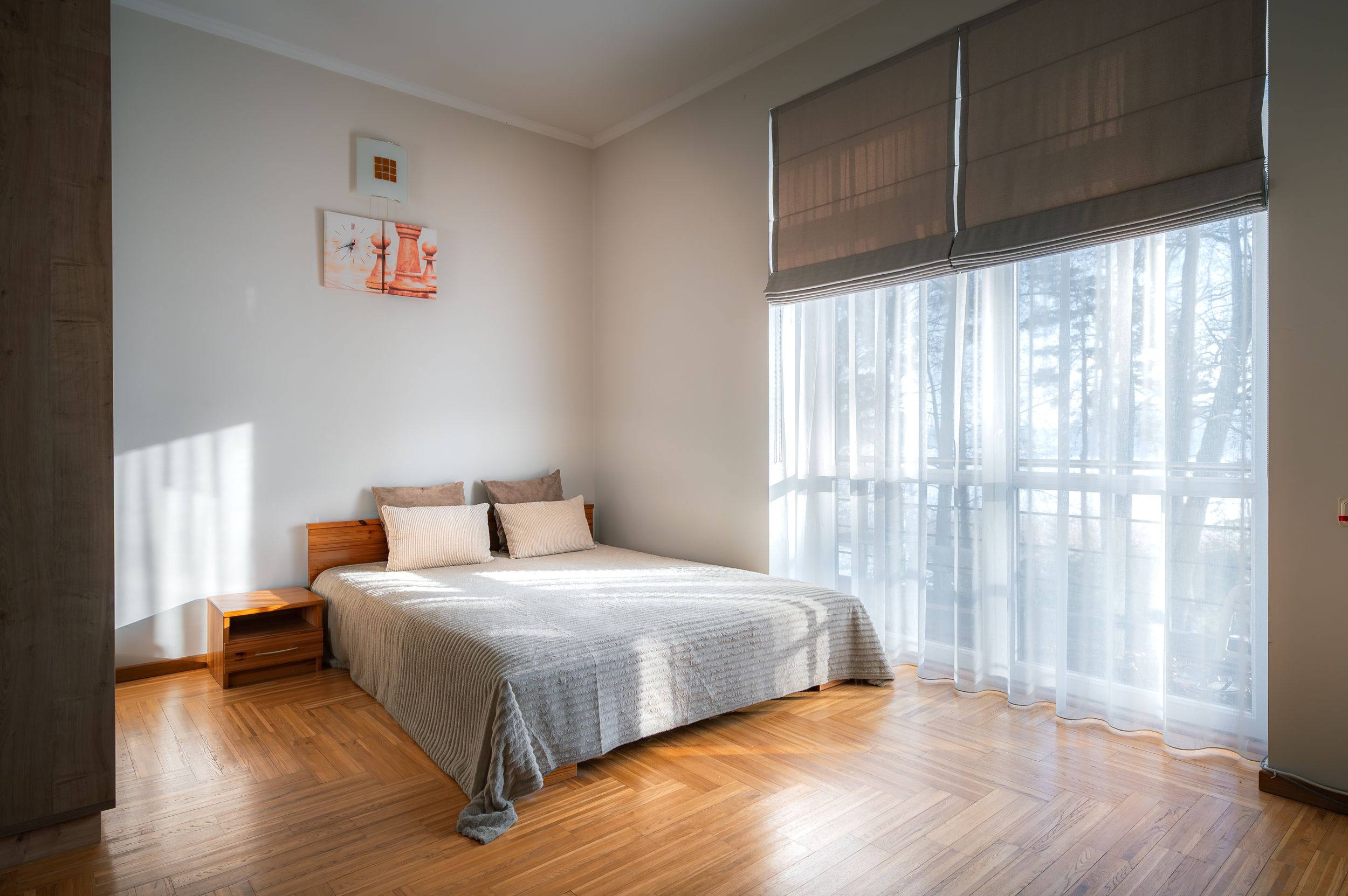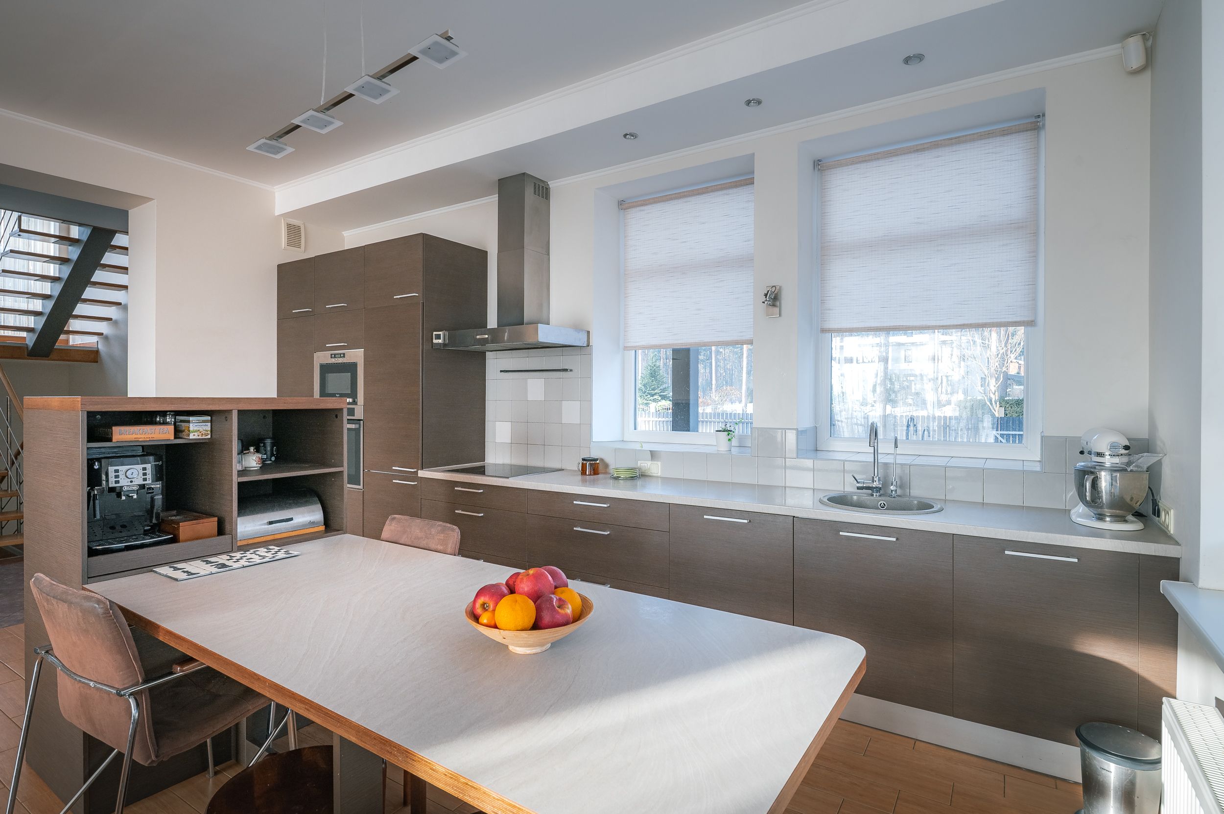 Natural and long-lasting materials are used in the interior – oak parquet flooring and stairs, wooden interior doors, and a neutral colour palette that creates a calm, harmonious, and welcoming atmosphere. High ceilings add light and a sense of spaciousness, while the fireplace in the living room creates a special sense of cosiness during the autumn and winter seasons.