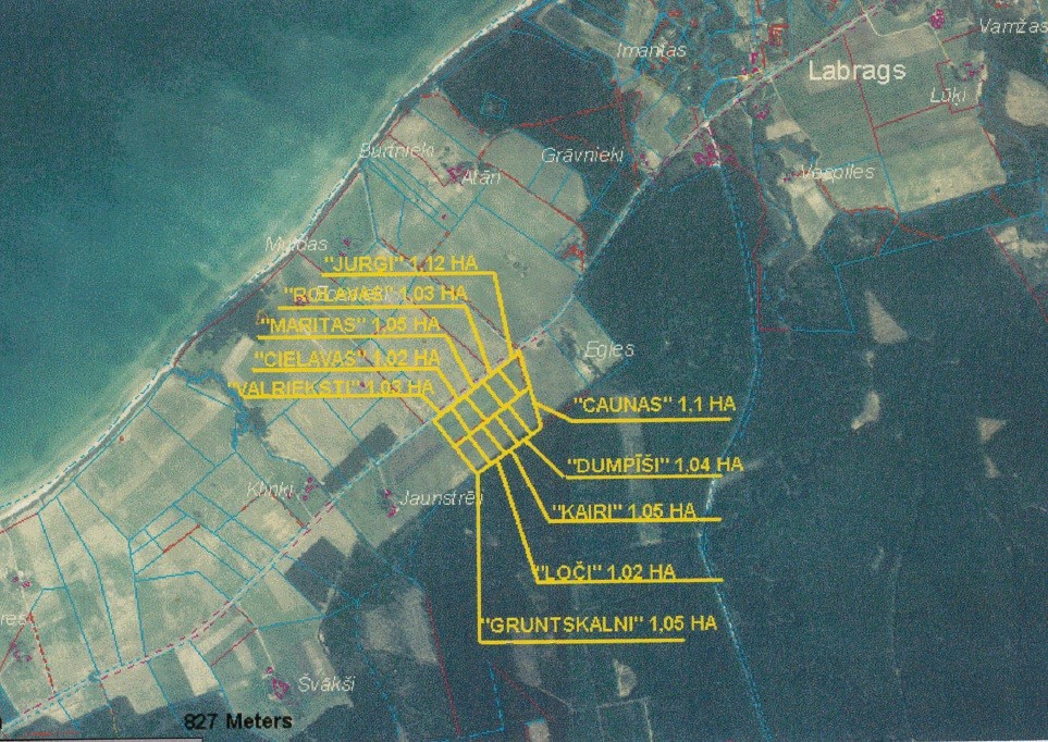 Pārdod 10 apbūves gabalus Sakas pagastā, Ulmalē. Zemes īpašumi ir pieejami platībās no 10 200 m2 līdz 11 200 m2, cena- 1 EUR/m2.