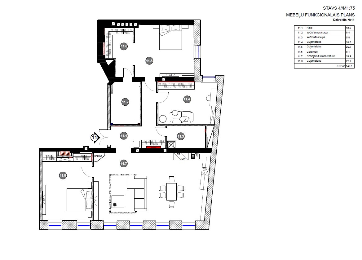 Dzīvoklim ir pārdomāts plānojums, kas sastāv no viesistabas, kas apvienota ar virtuves zonu, 3 guļamistabām, 2 sanmezgliem un garderobes telpas. Dzīvoklī ir iebūvētie skapji un virtuves iekārtas, aizkari, gaismas ķermeņi.