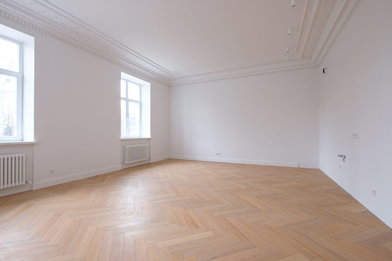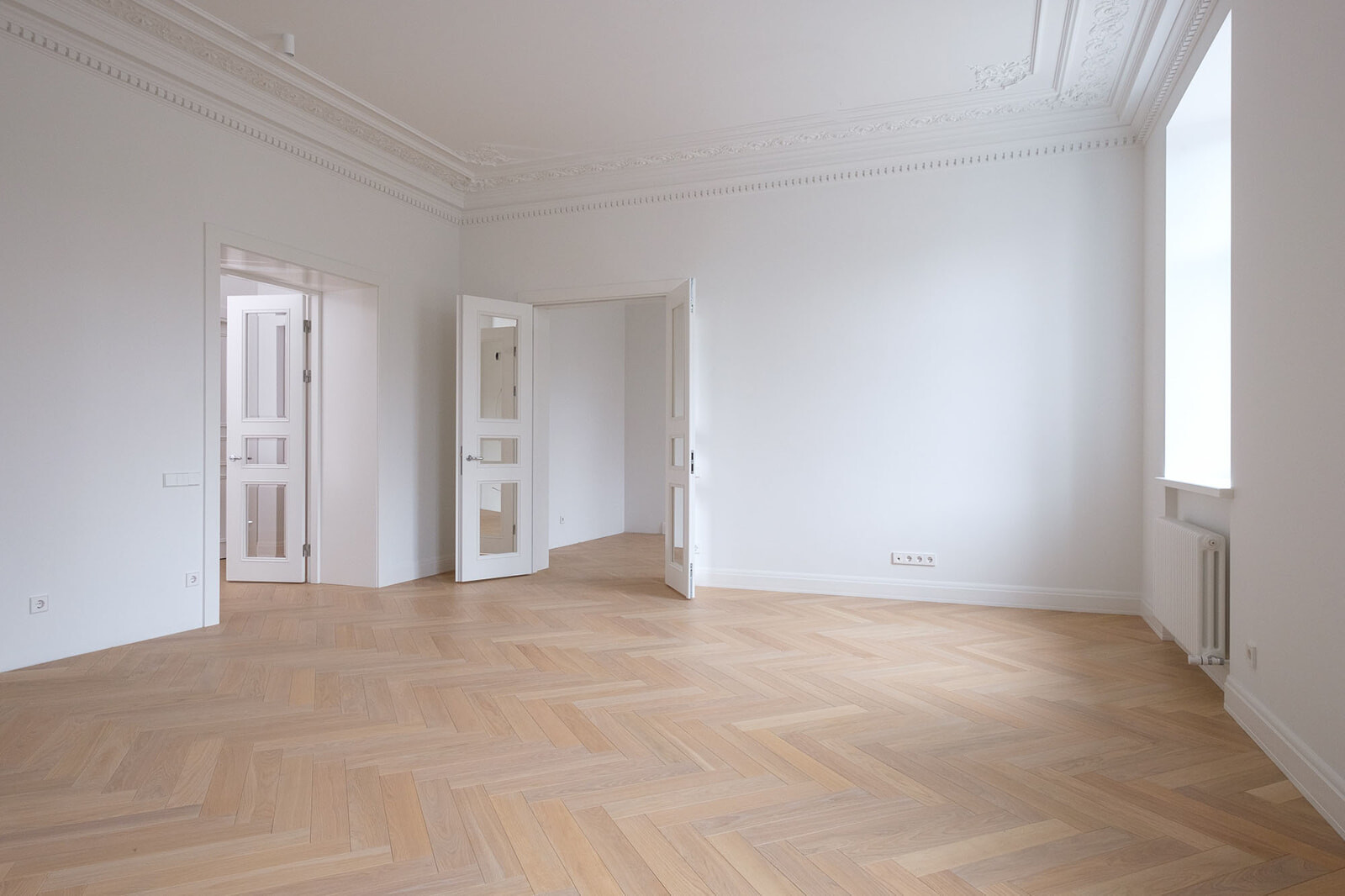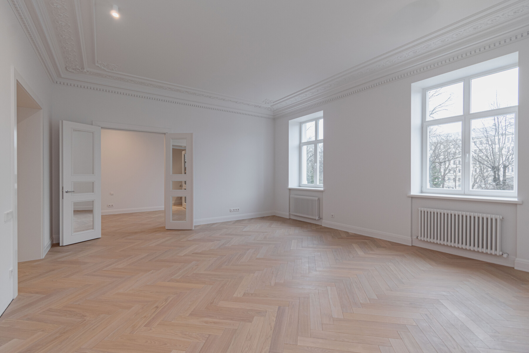 Renovēta ēka ar izcilu un augstas kvalitātes dzīvokļu iekšējo apdari – ozola parkets, izmeklēta furnitūra, durvju rokturi un radiatori, akmens masas vannas, augstas kvalitātes santehnika no ražotāja Flaminia, pelēkbaltas marmora imitācijas itāļu flīzes, ūdens maisītāji no ražotāja Giulini. Īpašu vērtību dzīvokļiem piešķir restaurētie griestu dekori un karnīzes, izvelētās klasiskās augstās grīdlīstes, pēc oriģināla dizaina ražotas 2,4 m augstas durvis.