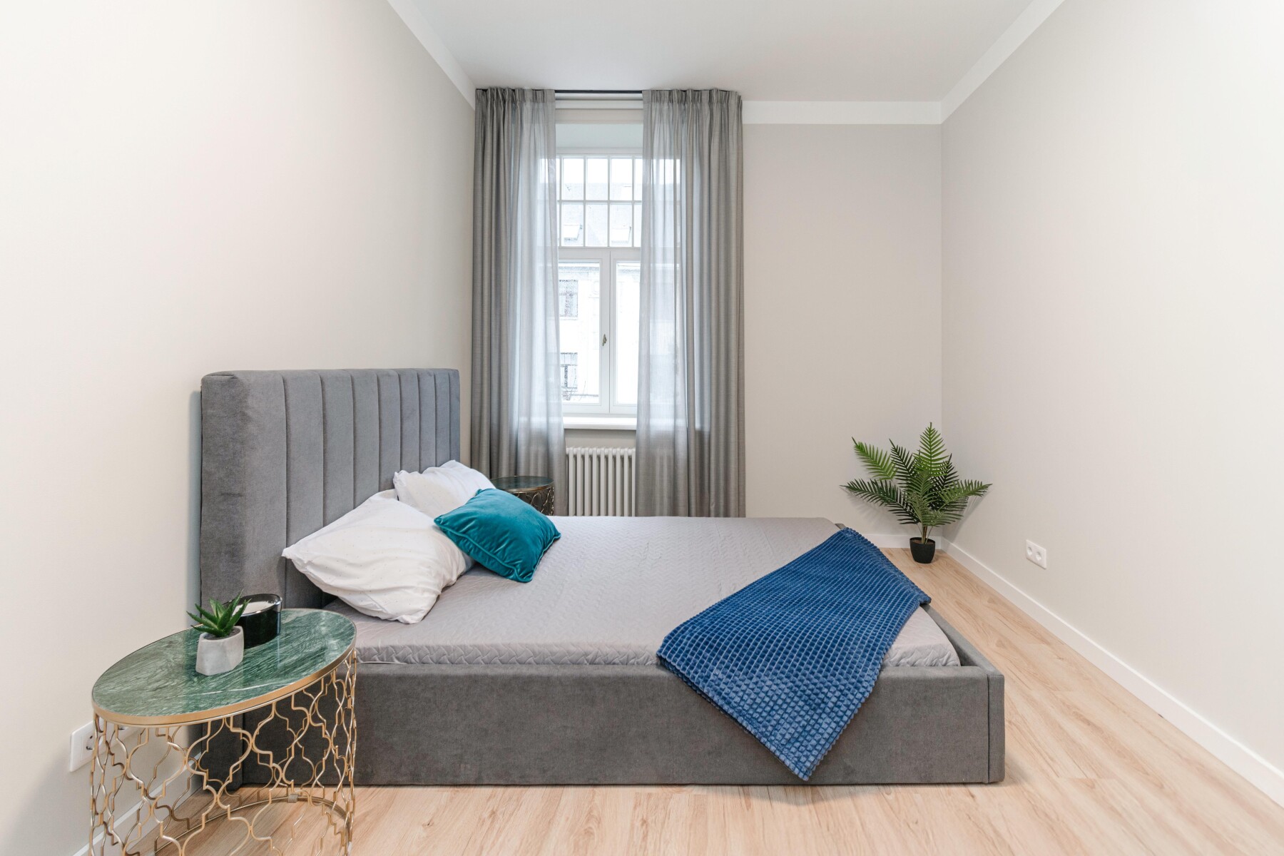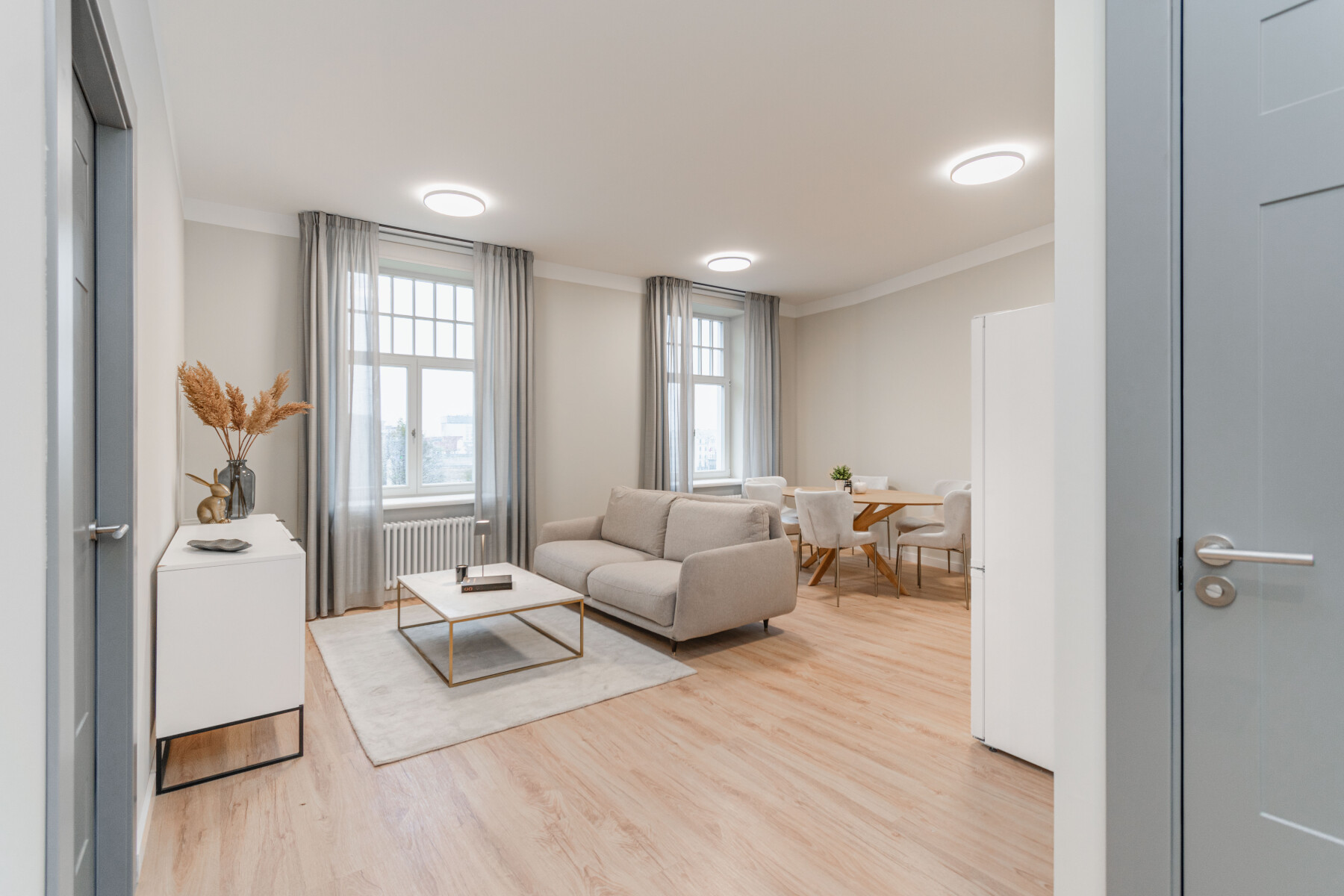Izīrē pilnībā mēbelētu 2-istabu dzīvokli restaurētā jūgendstila namā Rīgas centrā - Krišjāņa Valdemāra ielā 61.
