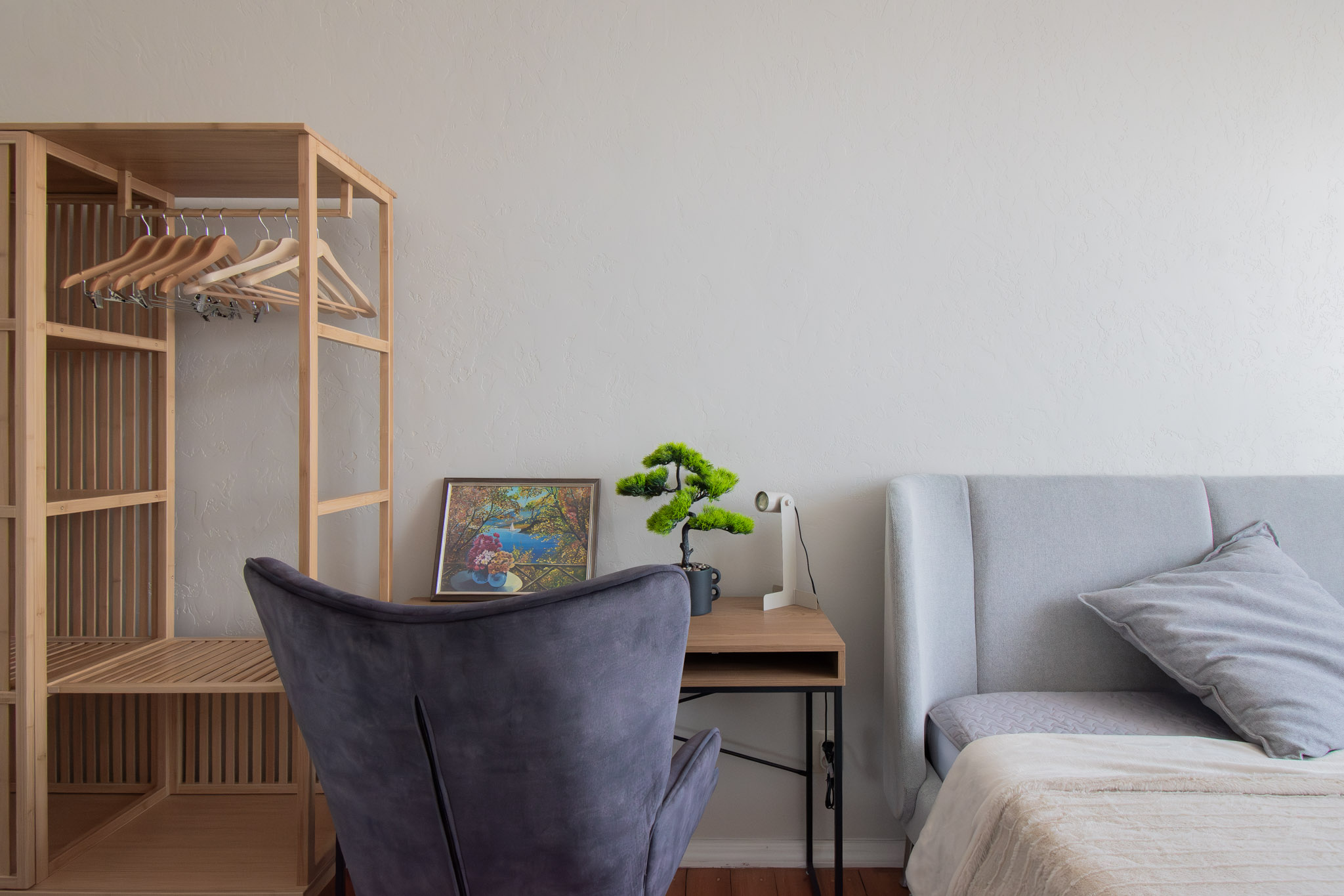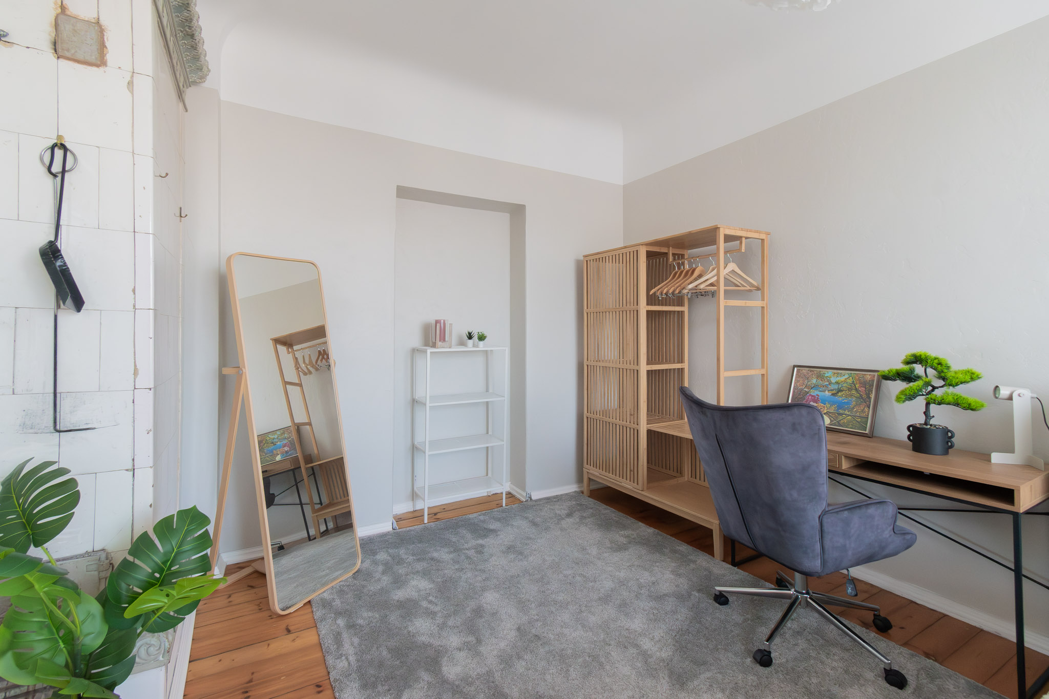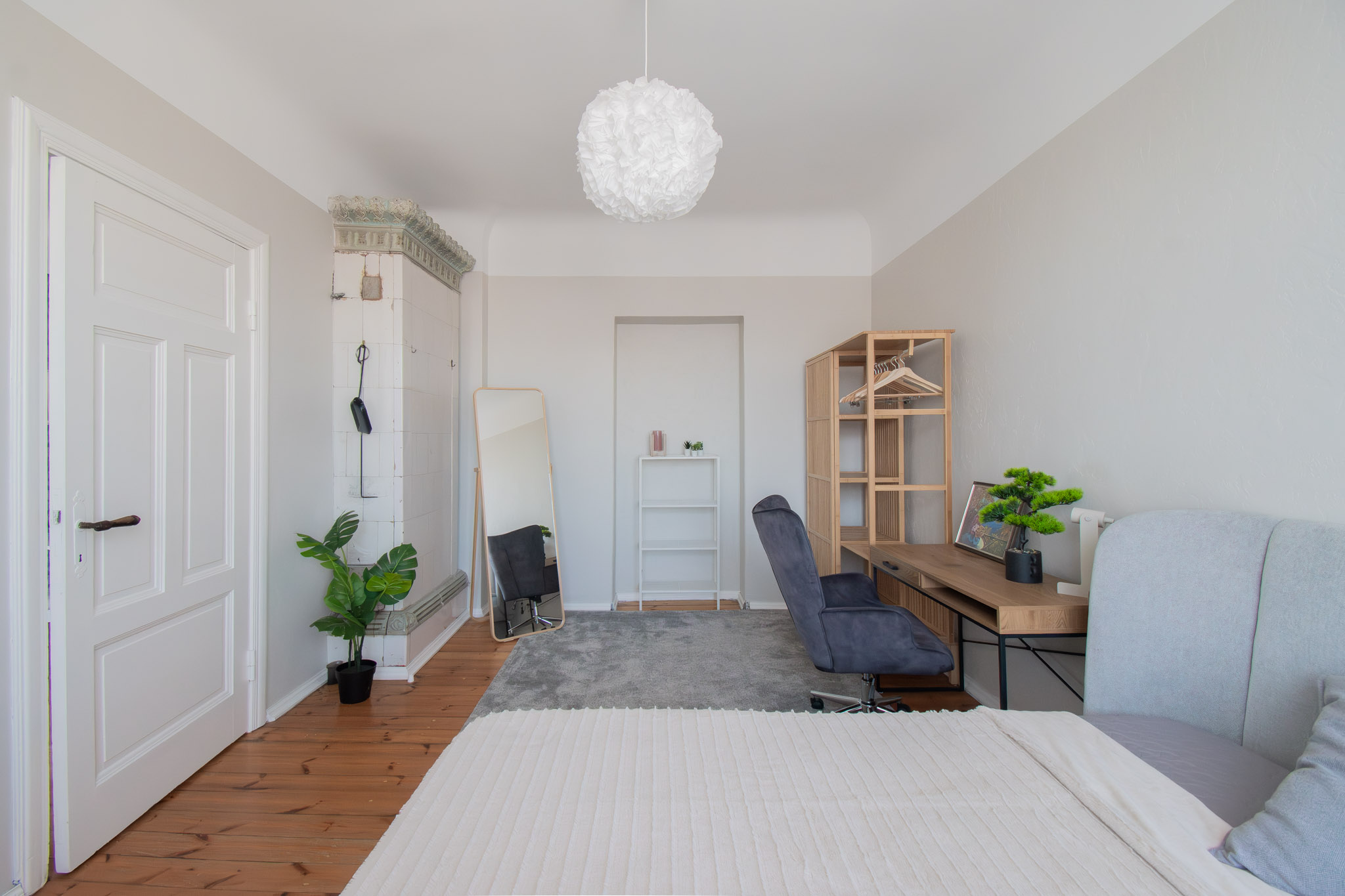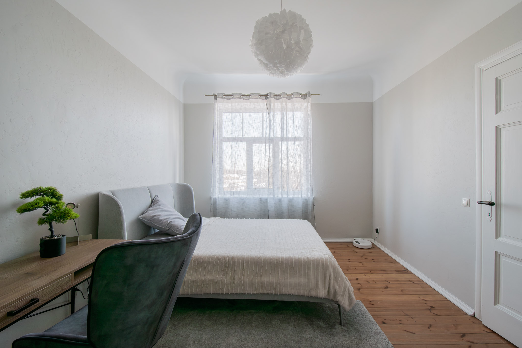Izolēta guļamistaba, plaša dzīvojamā istaba, virtuve, vannas istaba ar dušu, priekštelpa ar iebūvēto skapi, WC.