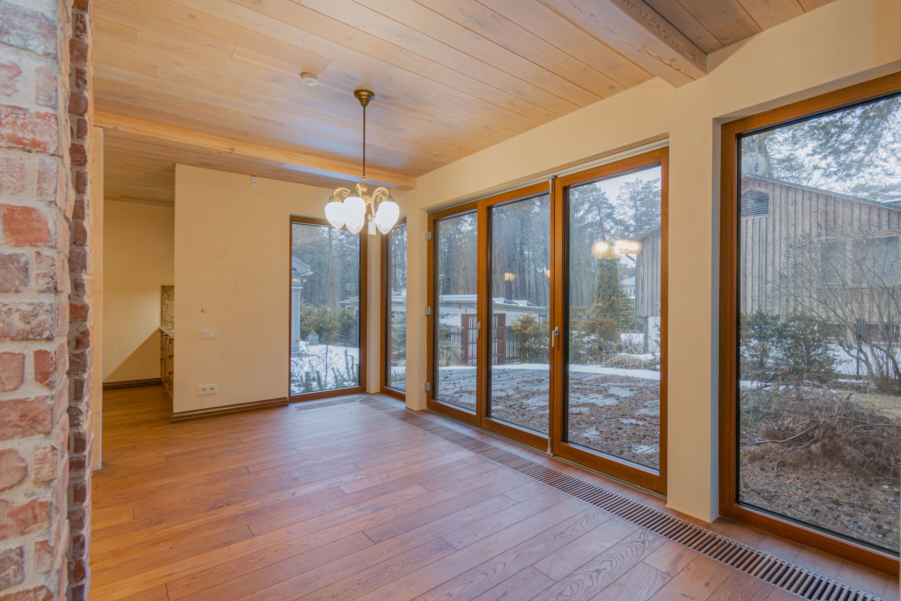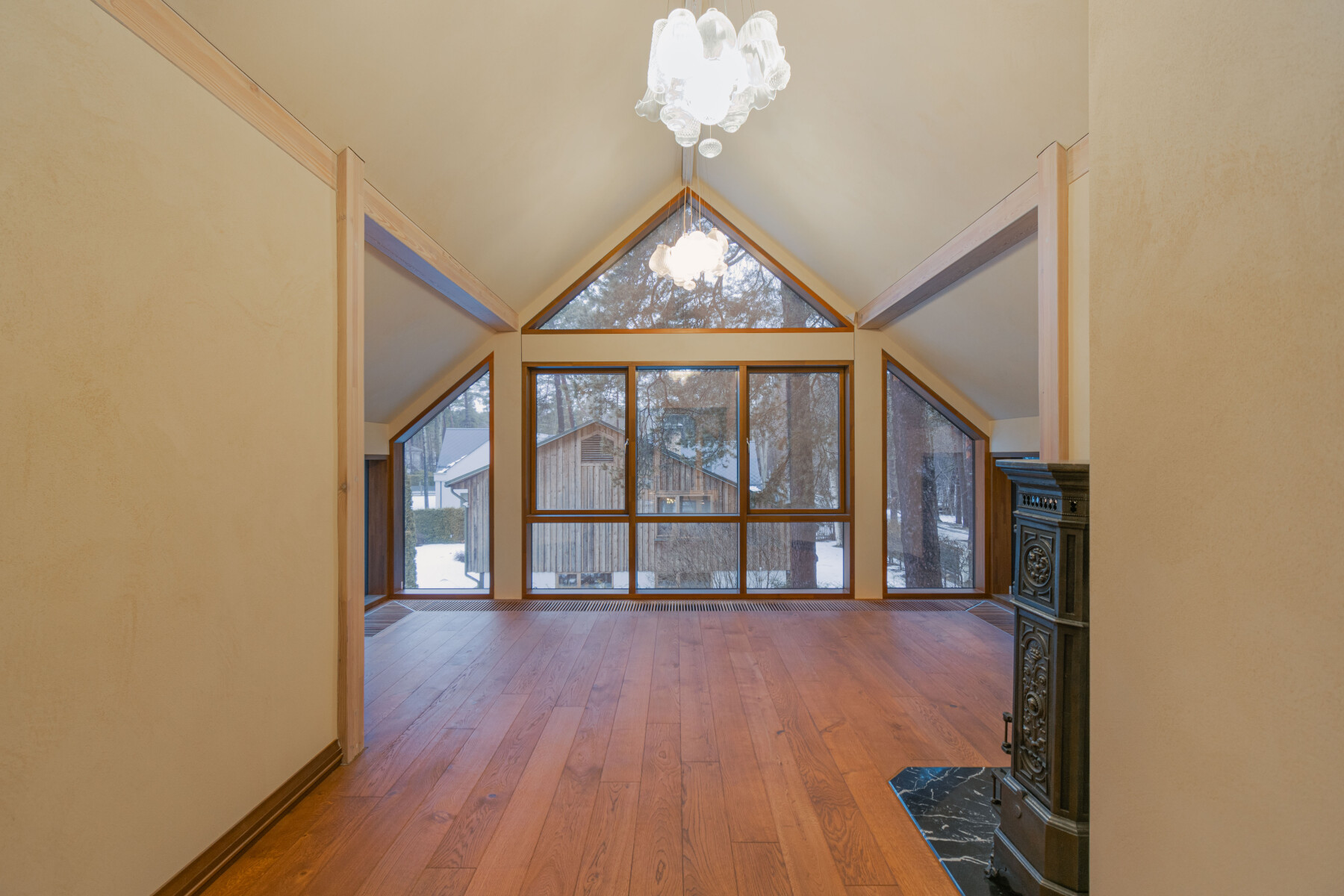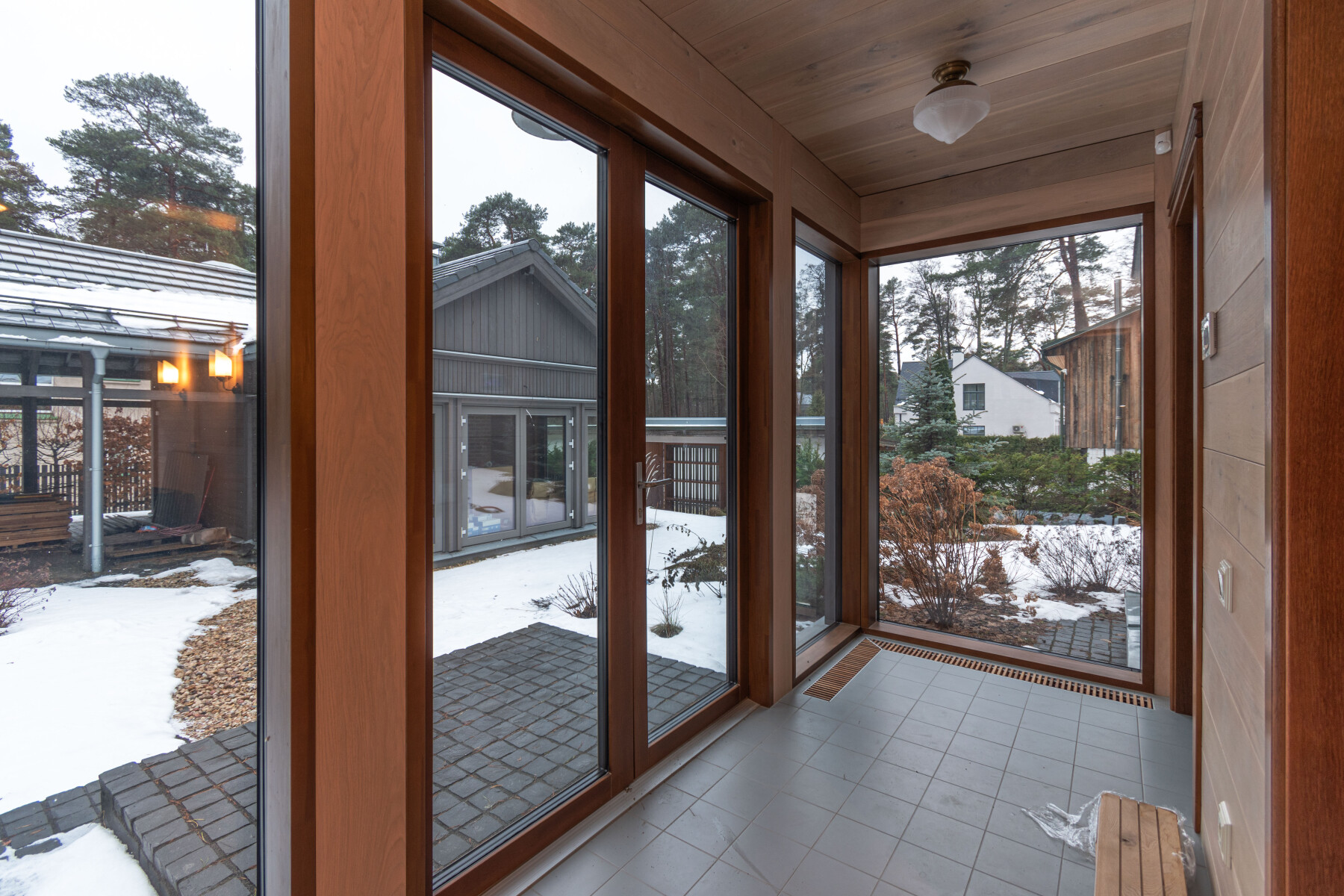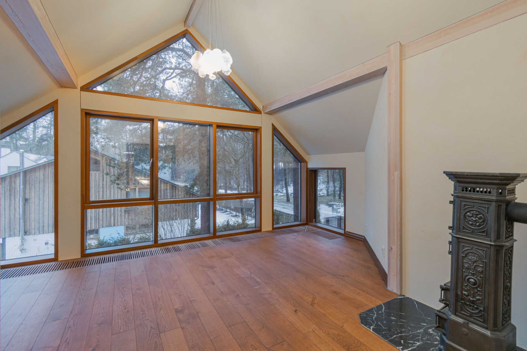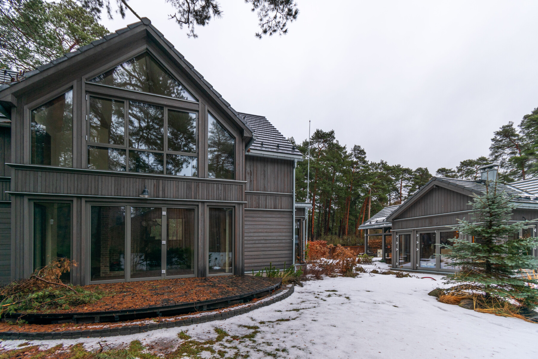 Окна: Большие и широкие деревоалюминиевые окна с трехкамерным пакетом, установленные по скандинавскому решению, обеспечивающие оптимальную теплоизоляцию и тишину в помещениях.