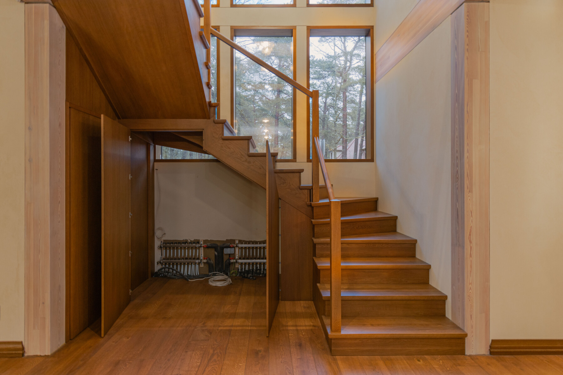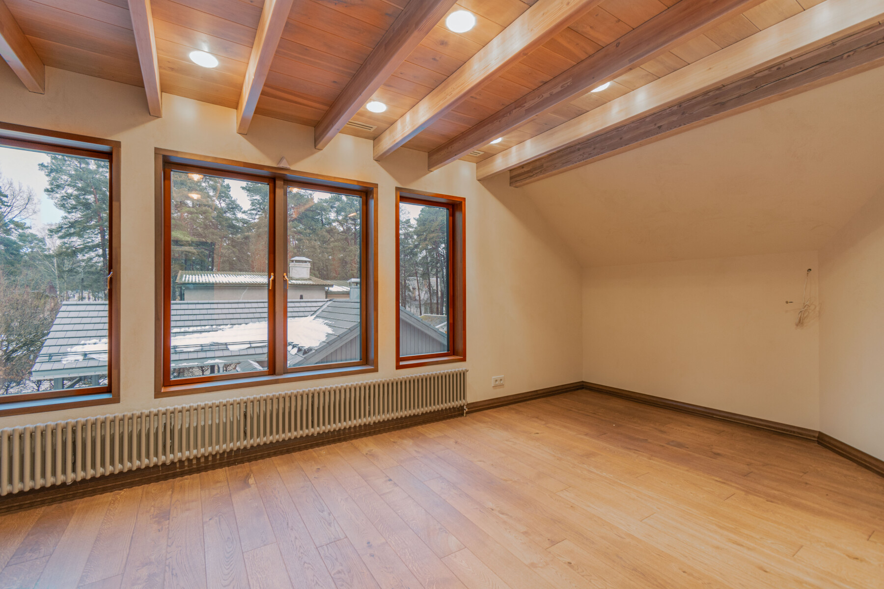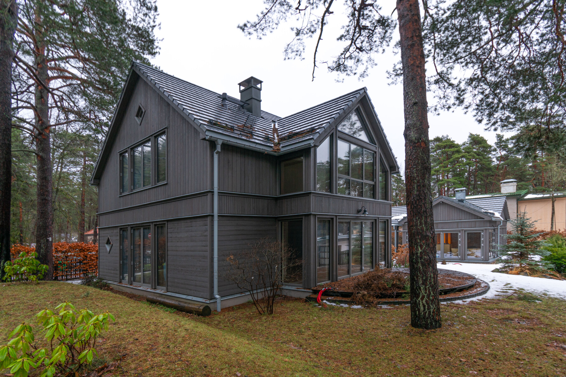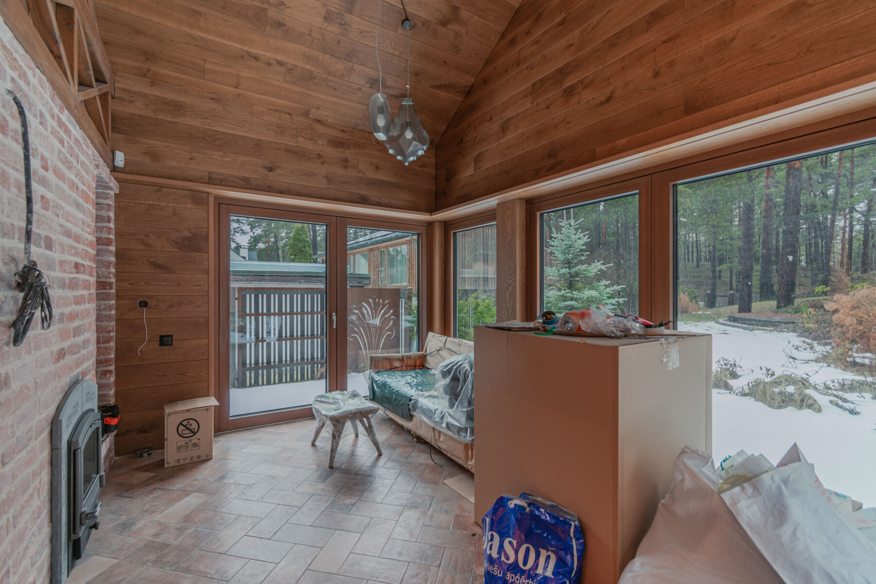 Окна: Большие и широкие деревоалюминиевые окна с трехкамерным пакетом, установленные по скандинавскому решению, обеспечивающие оптимальную теплоизоляцию и тишину в помещениях.