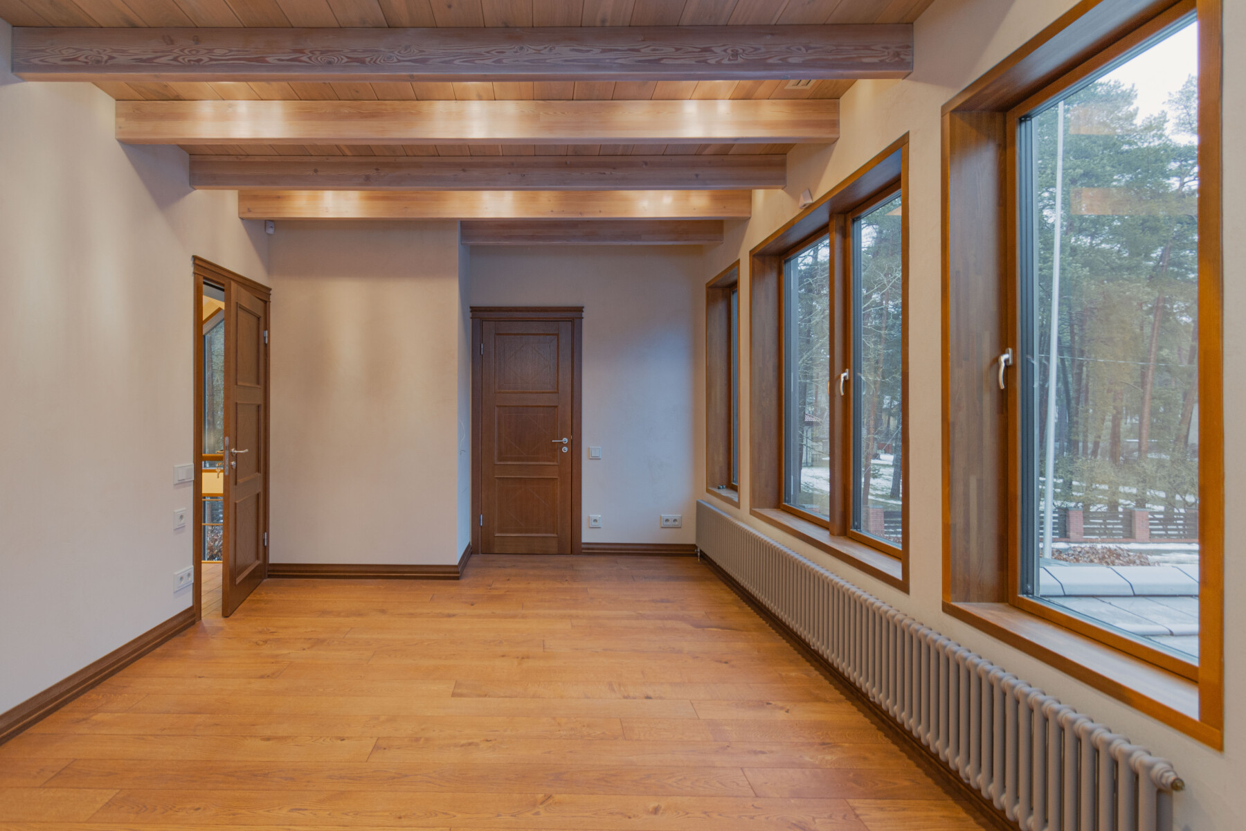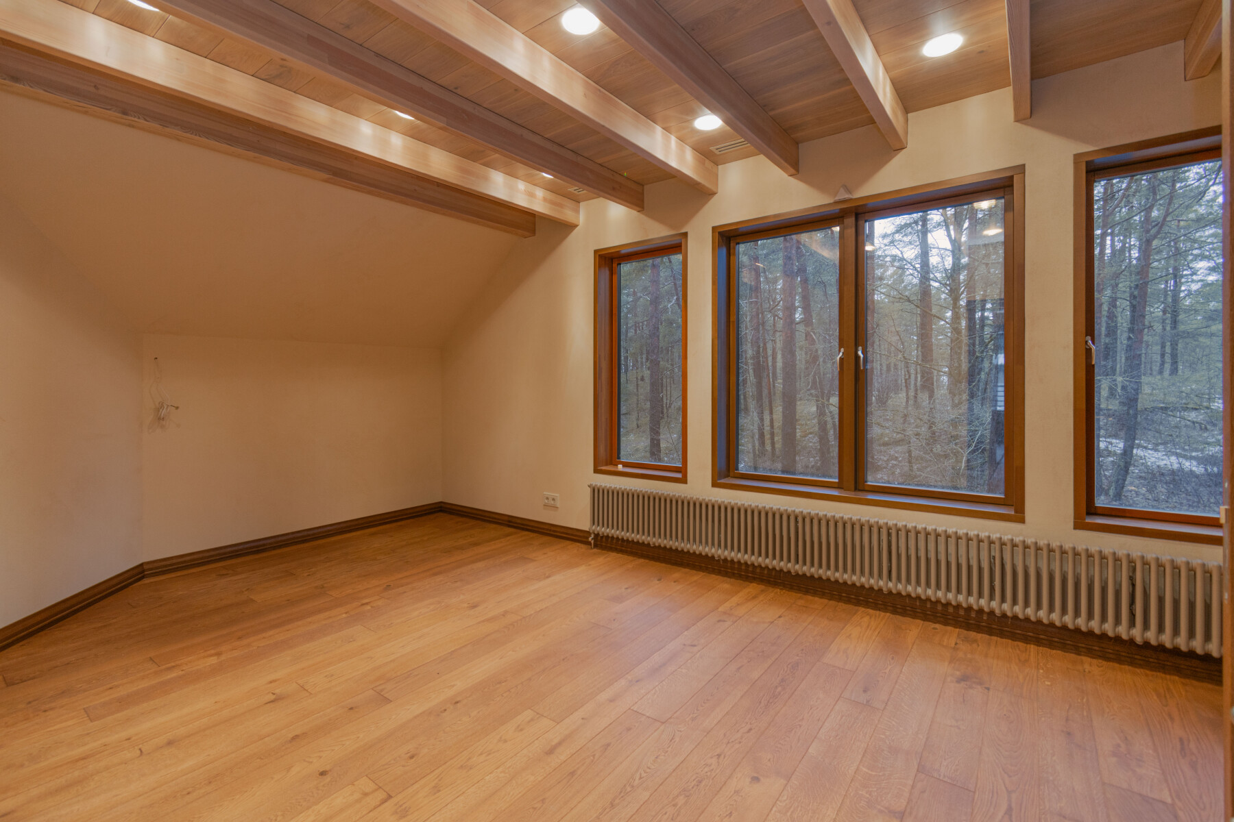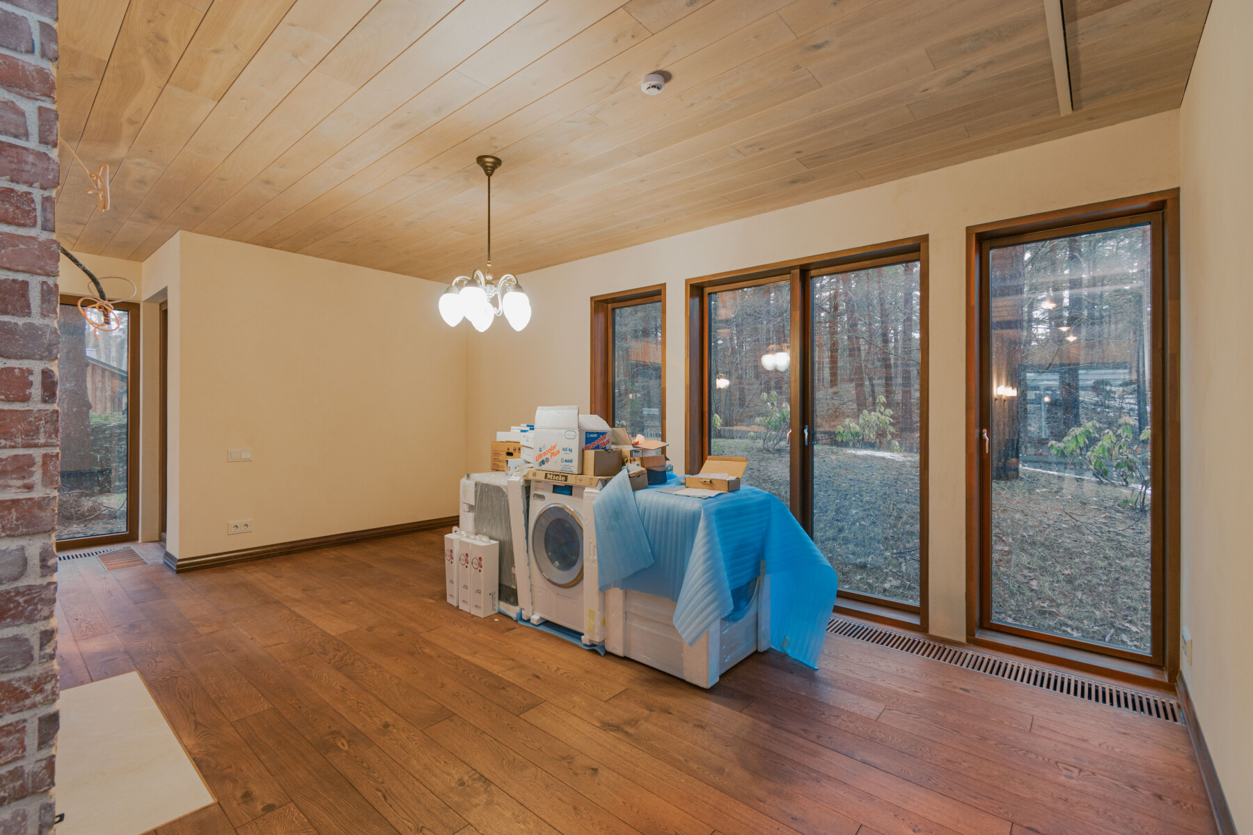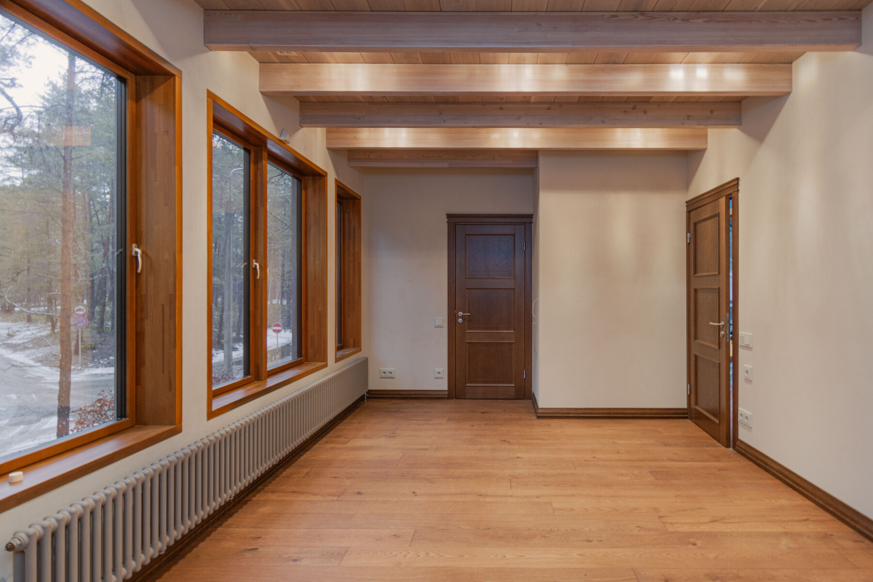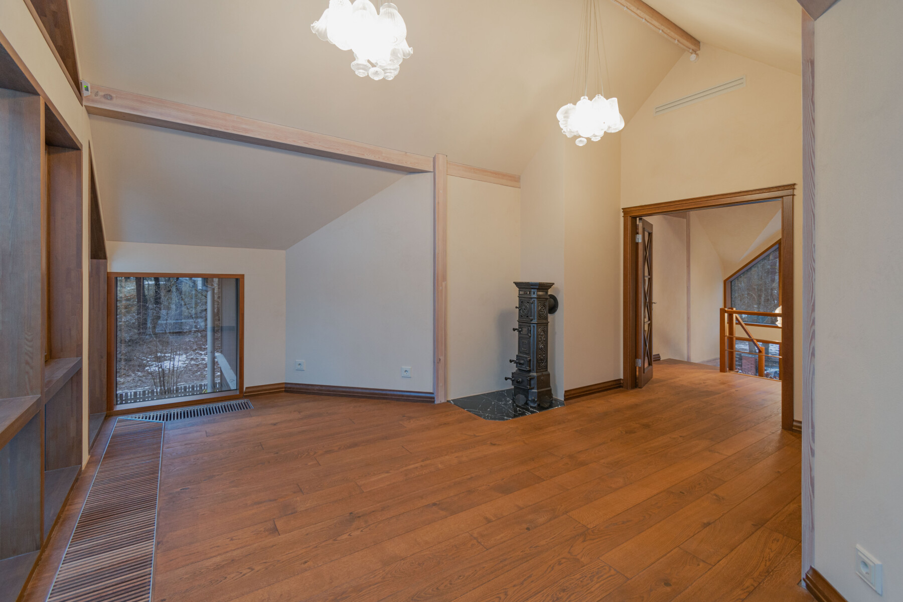 Окна: Большие и широкие деревоалюминиевые окна с трехкамерным пакетом, установленные по скандинавскому решению, обеспечивающие оптимальную теплоизоляцию и тишину в помещениях.
