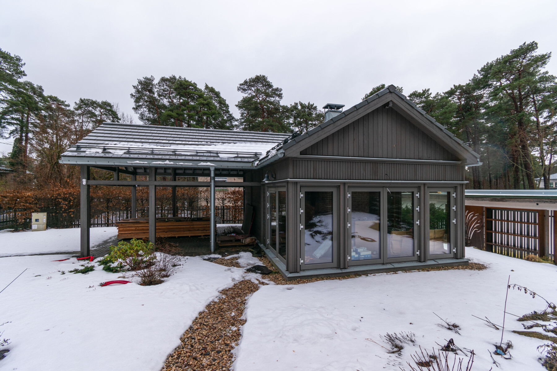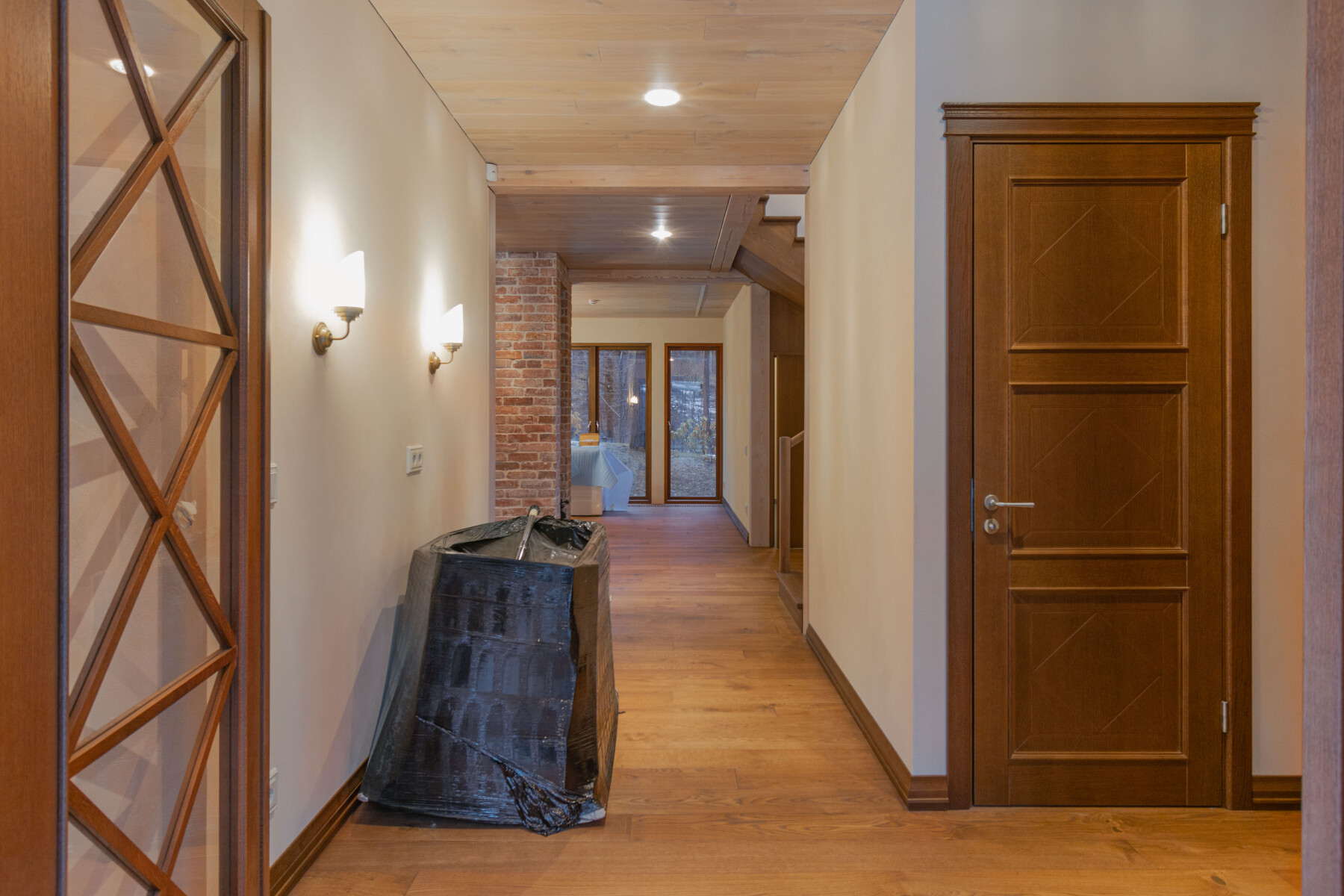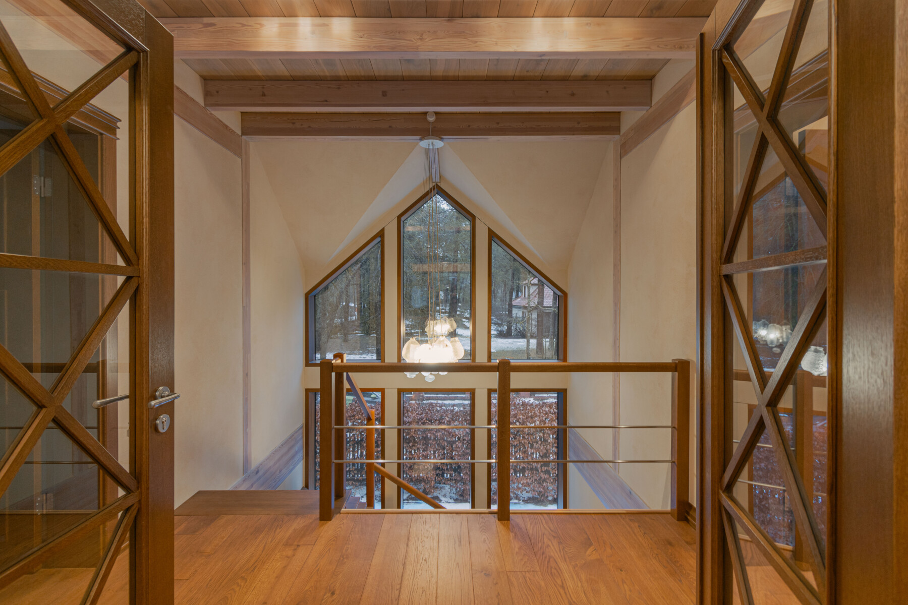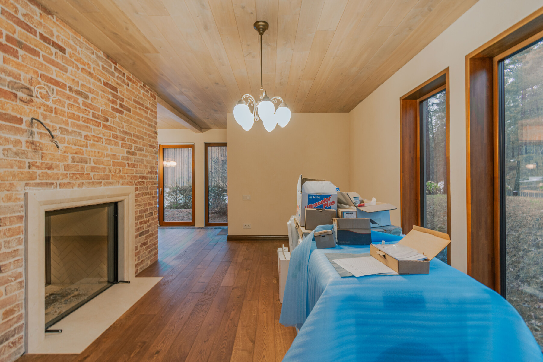 Окна: Большие и широкие деревоалюминиевые окна с трехкамерным пакетом, установленные по скандинавскому решению, обеспечивающие оптимальную теплоизоляцию и тишину в помещениях.