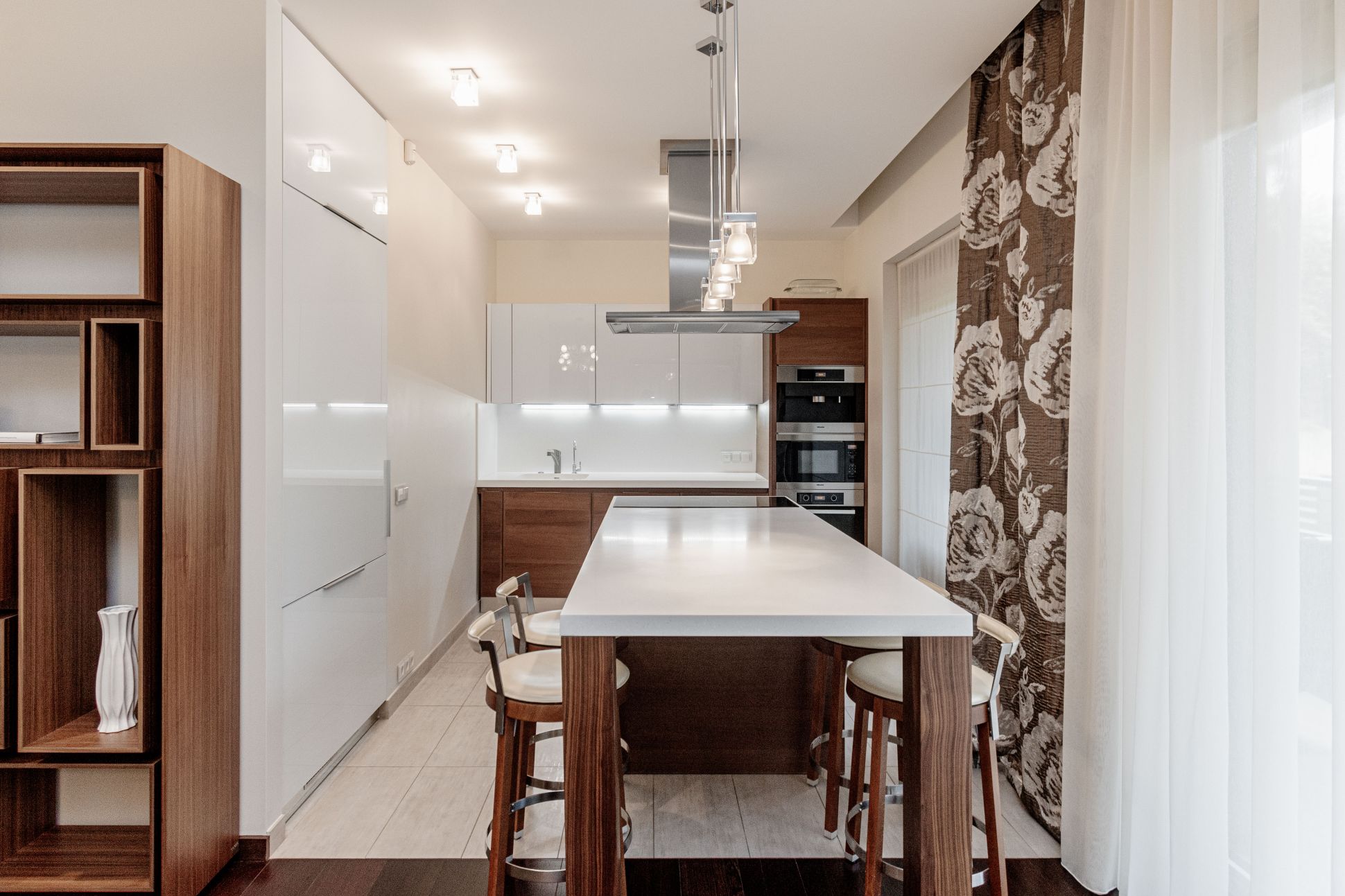 Светлая и просторная гостиная с камином, совмещённая с современной кухней.