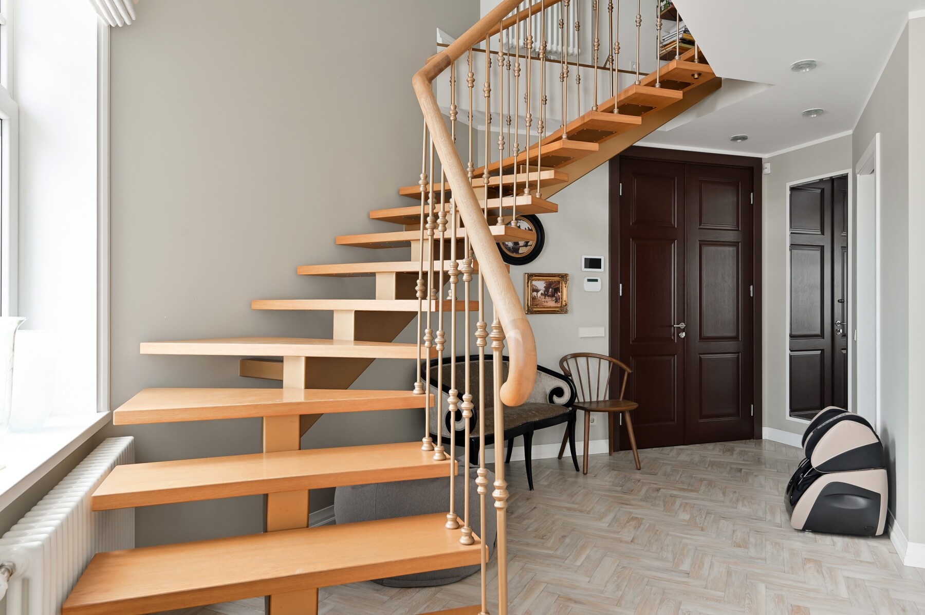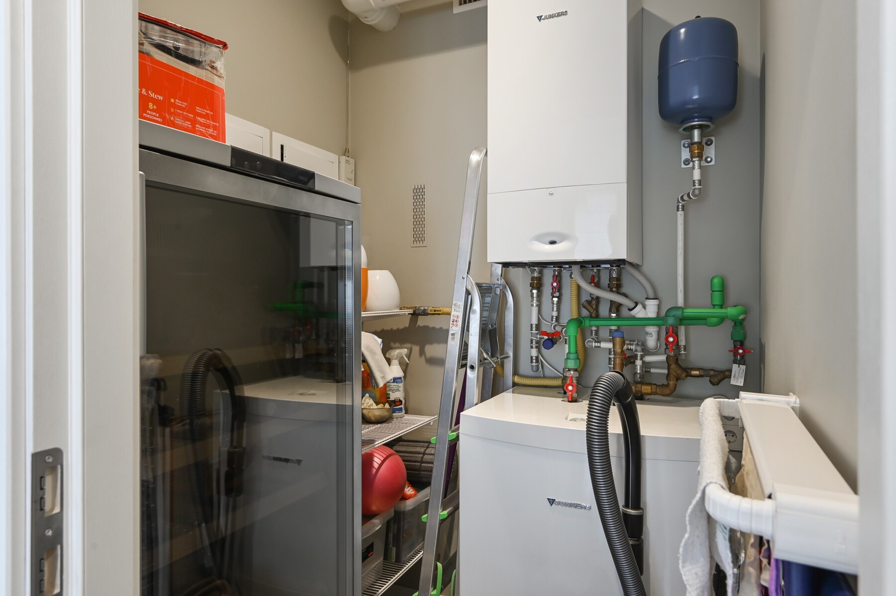 Layout of the 1st floor of the apartment – a spacious living room combined with a kitchen area, a utility room and a bathroom.