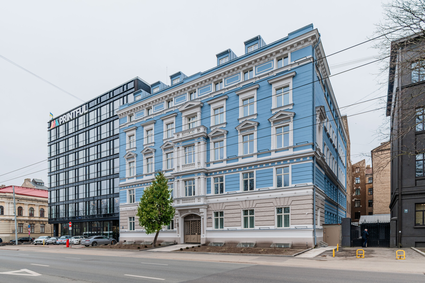 Здание отреставрировали, сохранив исторические ценности. Здание спроектировано архитектором Янисом Фридрихом Бауманисом и построено в 1874 году. Архитектор спроектировал множество других замечательных зданий в центре Риги. Фасад здания выполнен в стиле эклектики, в его дизайн включены элементы стилей ренессанса и классицизма, внутри здания исторические детали дополняются современным и лаконичным интерьером.