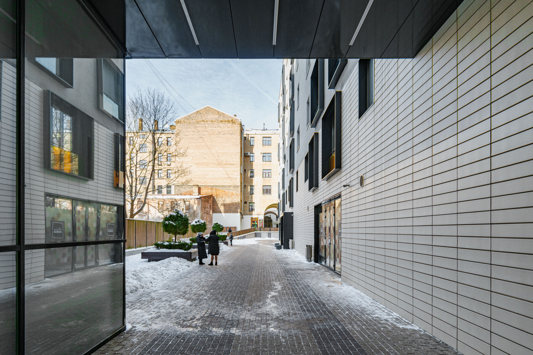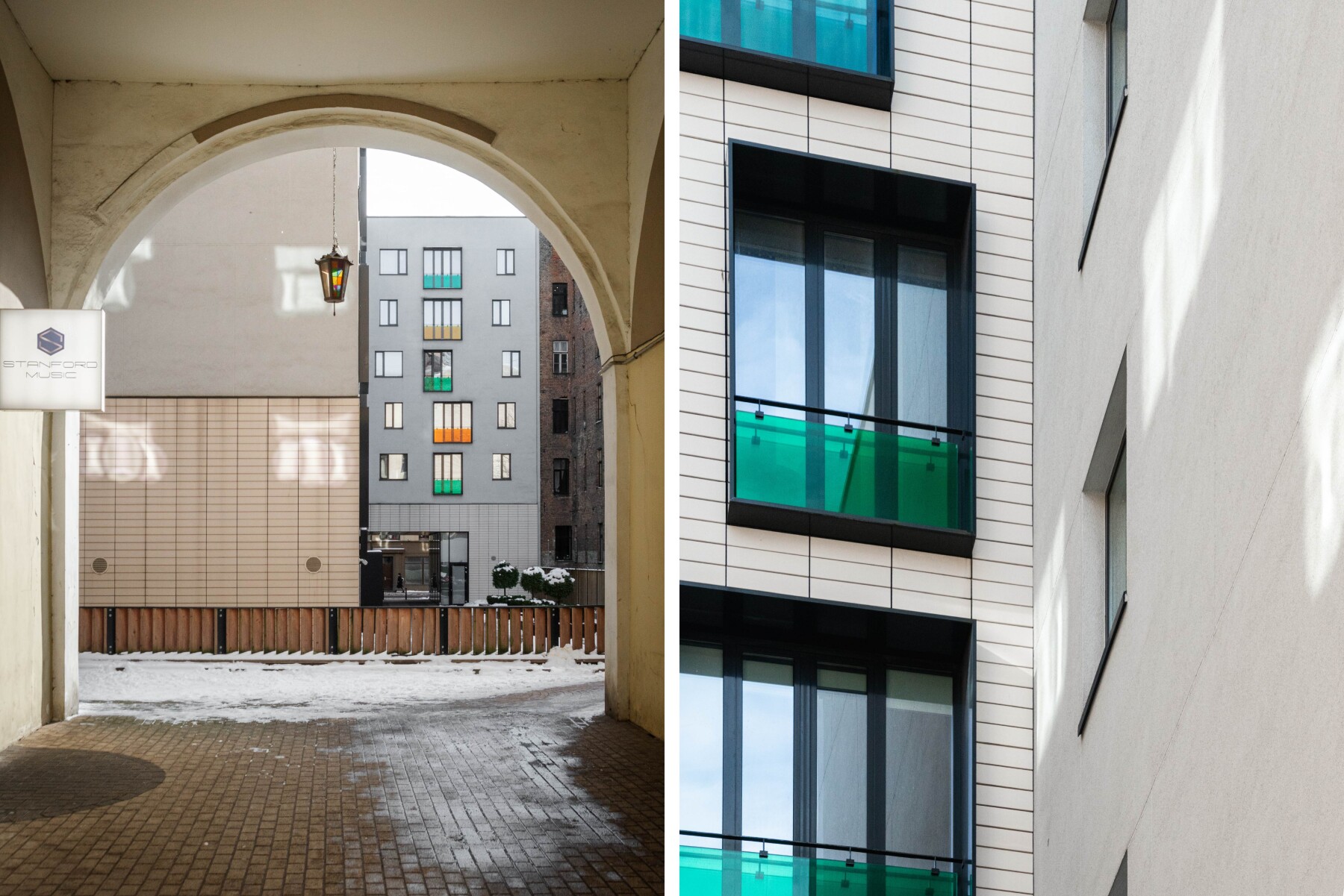 Двор дома – историческая пешеходная улица аркады Упиша – благоустроенная, освещенная и обильно озелененная, соединяет улицу Э. Бирзниека-Упиша с улицами Дзирнава, А. Чака и Лачплеша.