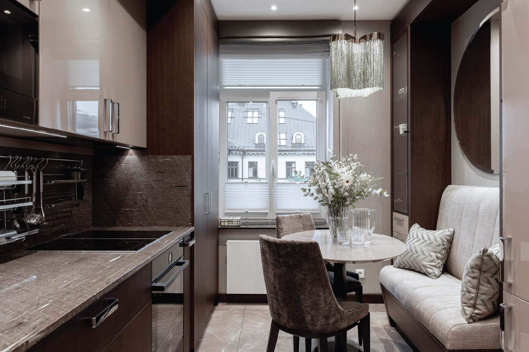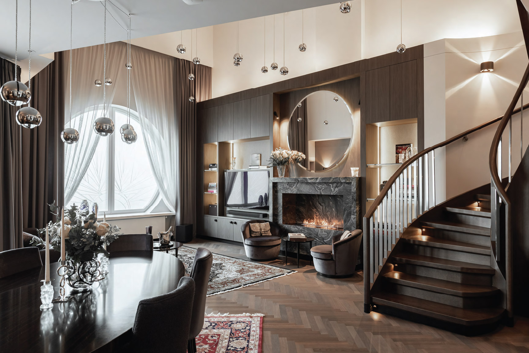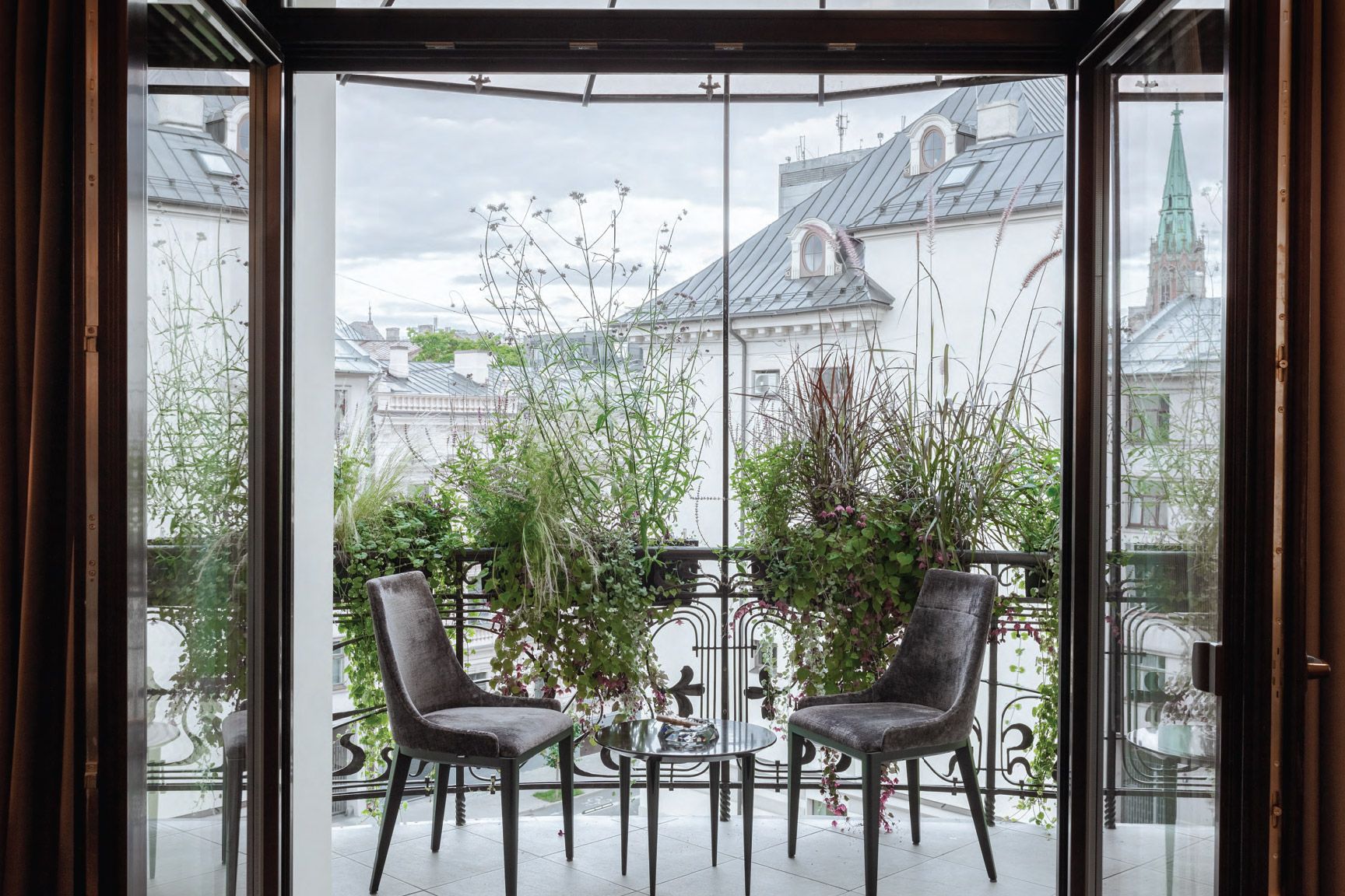 Квартира выделяется особенно просторной гостиной с потолками высотой шесть метров, впечатляющим декоративным круглым окном, биокамином, а также роскошным озеленённым балконом с великолепным видом на шпиль старой церкви Святой Гертруды и крыши окрестных домов.