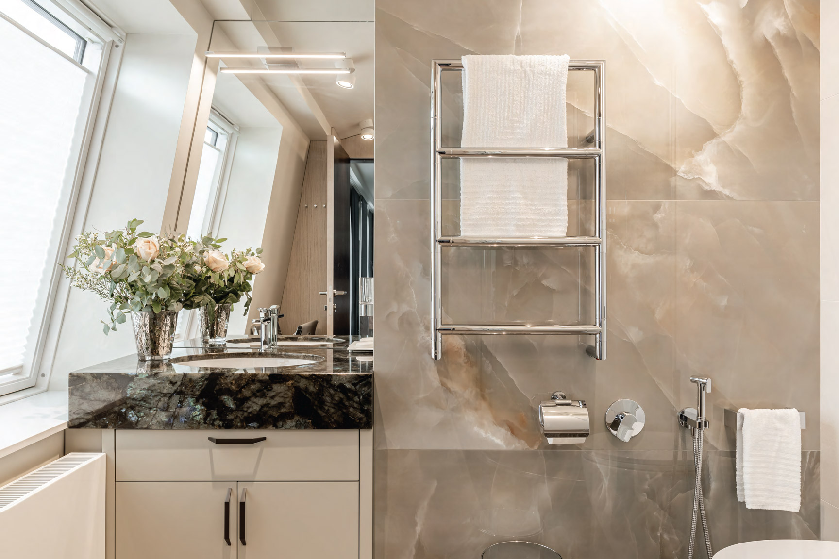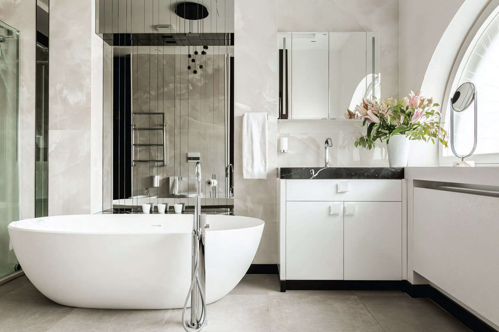 - Три ванные комнаты с туалетом (в главной ванной комнате есть ванна, душевая кабина, туалет, биде и раковина, а также большое декоративное полукруглое окно)