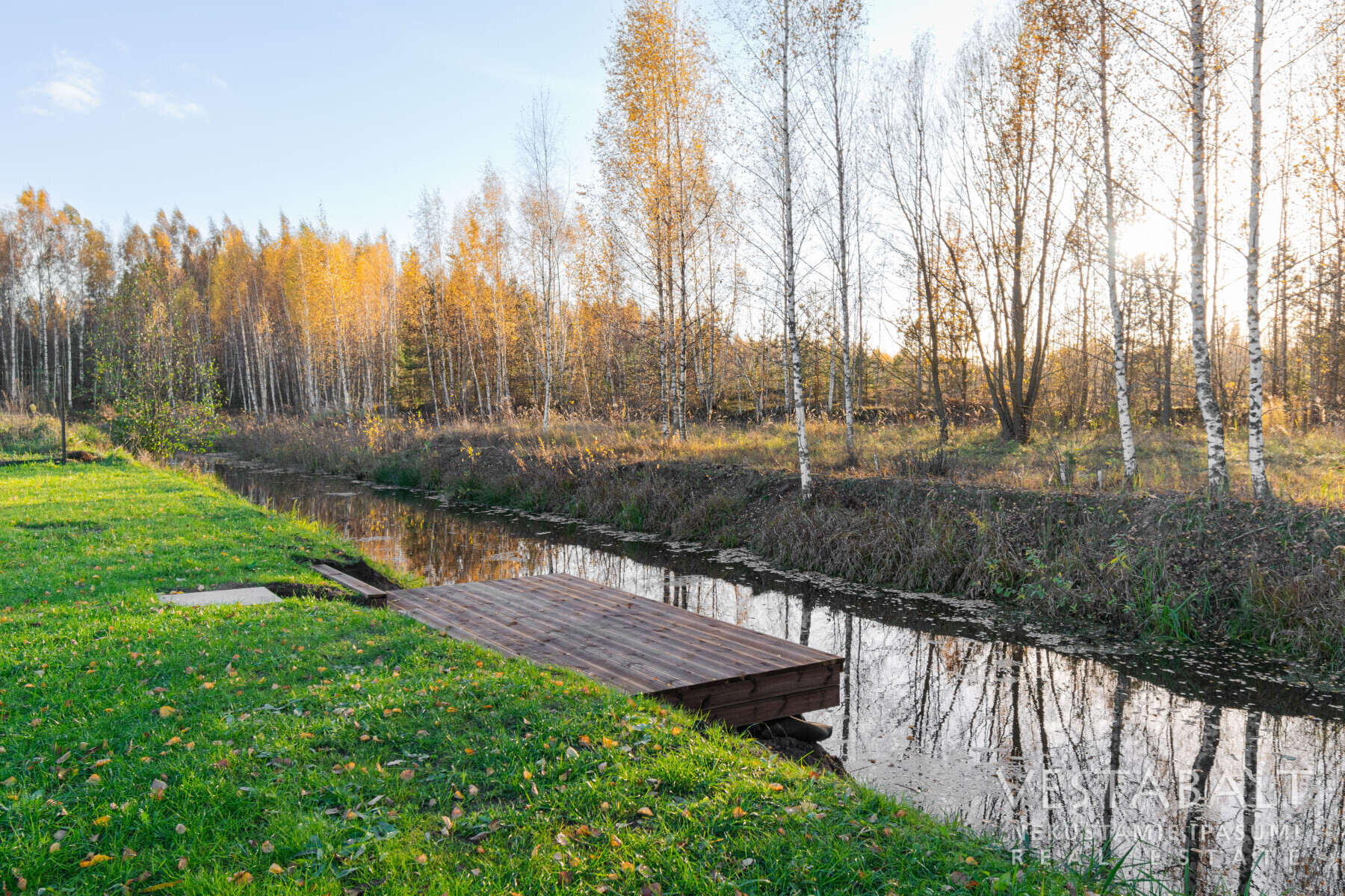 Уникальный характер, элегантность и простор дома обеспечивает гостиная зона с потолками высотой 4 метра и большими витринными окнами, выходящими на террасу, откуда открывается потрясающий вид на ландшафтный сад, окруженный живописной березовой рощей, и протекающую рядом реку Марупе.