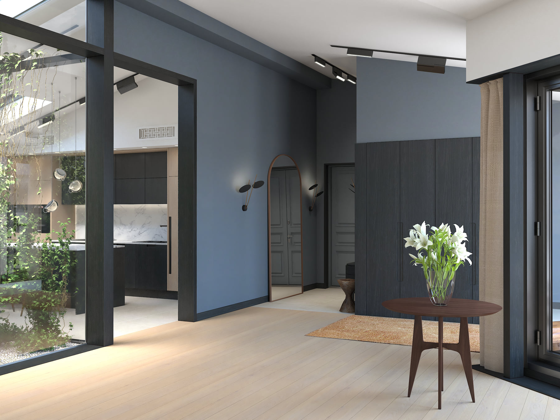 Dzīvokļa interjera projektus izstrādāja interjera dizainere Anna Djačenko, kura ir arī pārējo Ausekļa ielas 14 dzīvokļu interjera autore. Veidojot dzīvokļa interjeru ir daudz domāts par detaļām un tehniski sarežģītiem apdares risinājumiem, lai dzīvokļu gala apdare būtu tiešām augstvērtīga. Dzīvokļos tiks izbūvētas ozolkoka parketa grīdas, būs iedziļinātas augstās grīdlīstes, koka apdare logu ailās, individuāli izgatavoti koka sienu paneļi un skapji, kamīns, dizaina apgaismes ķermeņi, Laufen un Axor santehnika, kvalitatīvas dizaina flīzes. Dzīvokļi ir unikāli, jo tiem ir 4 metrus augsti griesti, plaši stikla logi, kas nodrošina izcilu izsauļojumu, āra terases zona un balkons. Abiem penthouse dzīvokļiem ir izbūvēti ziemas dārzi un ir nodrošinātas stāvvietas ēkas iekšpagalmā.